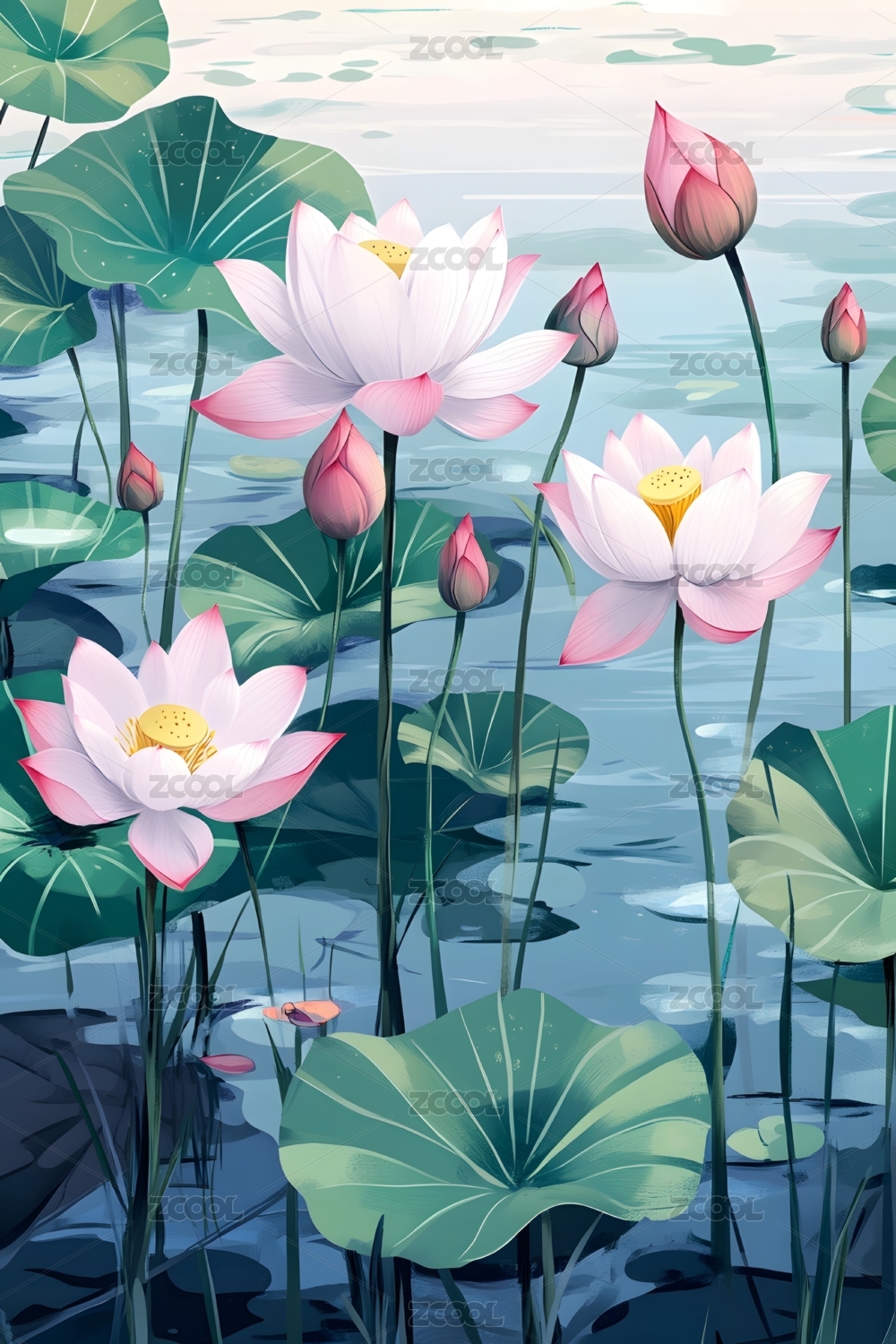 中国风夏季荷花荷塘艺术插画