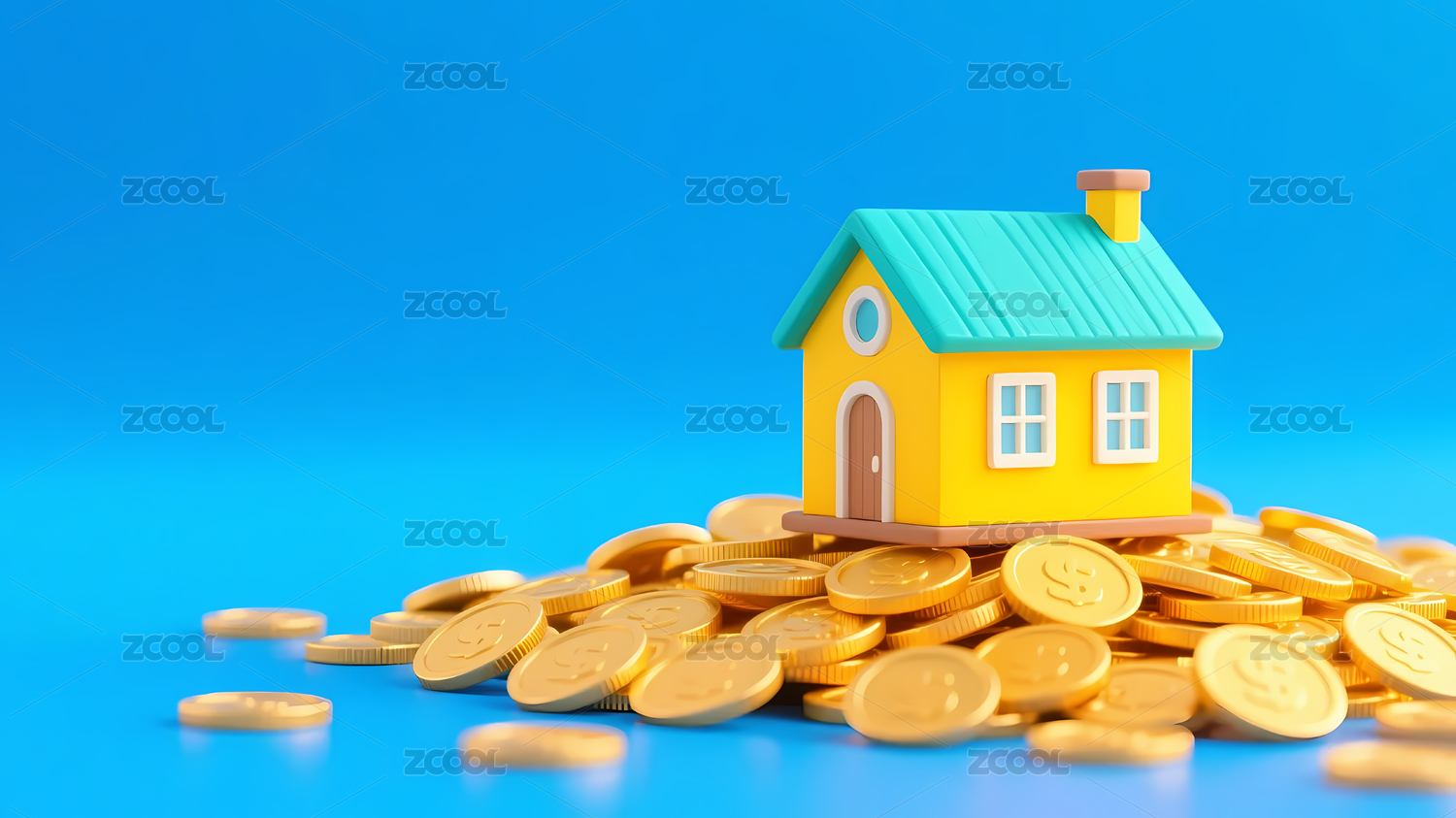 房地产金融概念图:3d 粘土风房子和金币