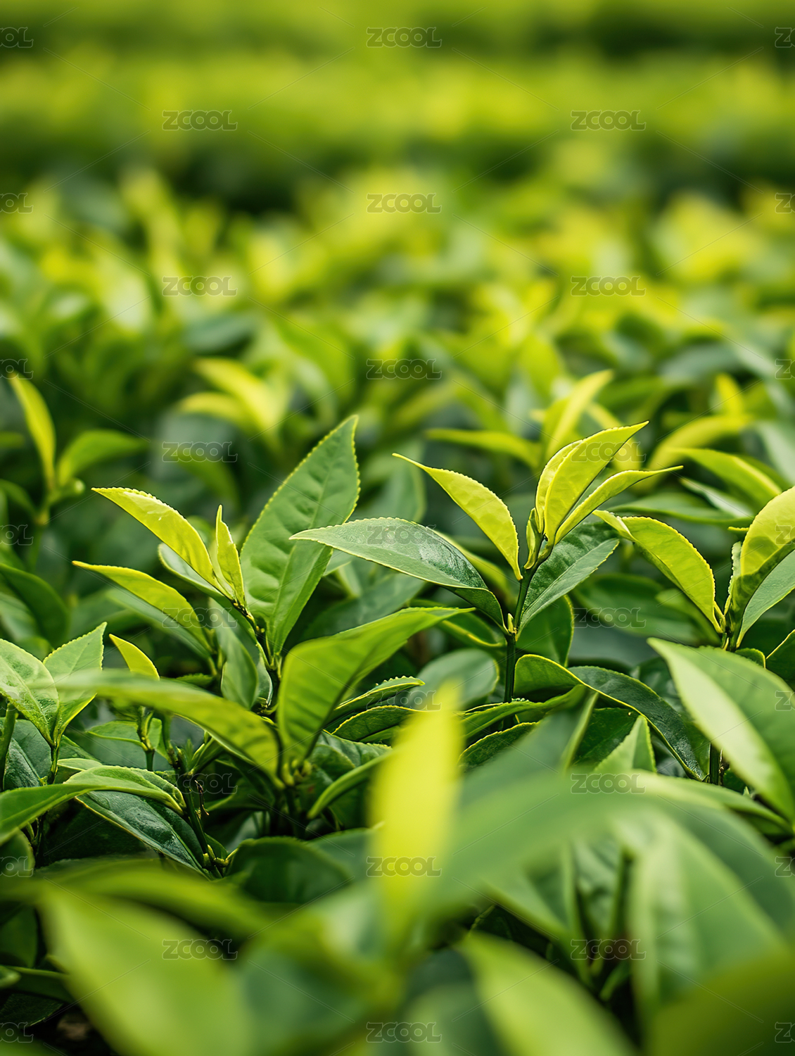 春天清晨茶园里嫩绿的茶树茶叶