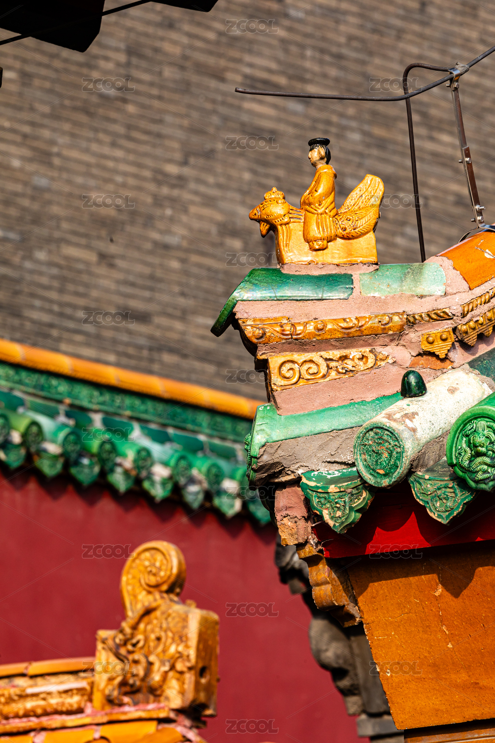 山西省平遥古城城隍庙内的古建筑彩绘屋檐斗拱构件