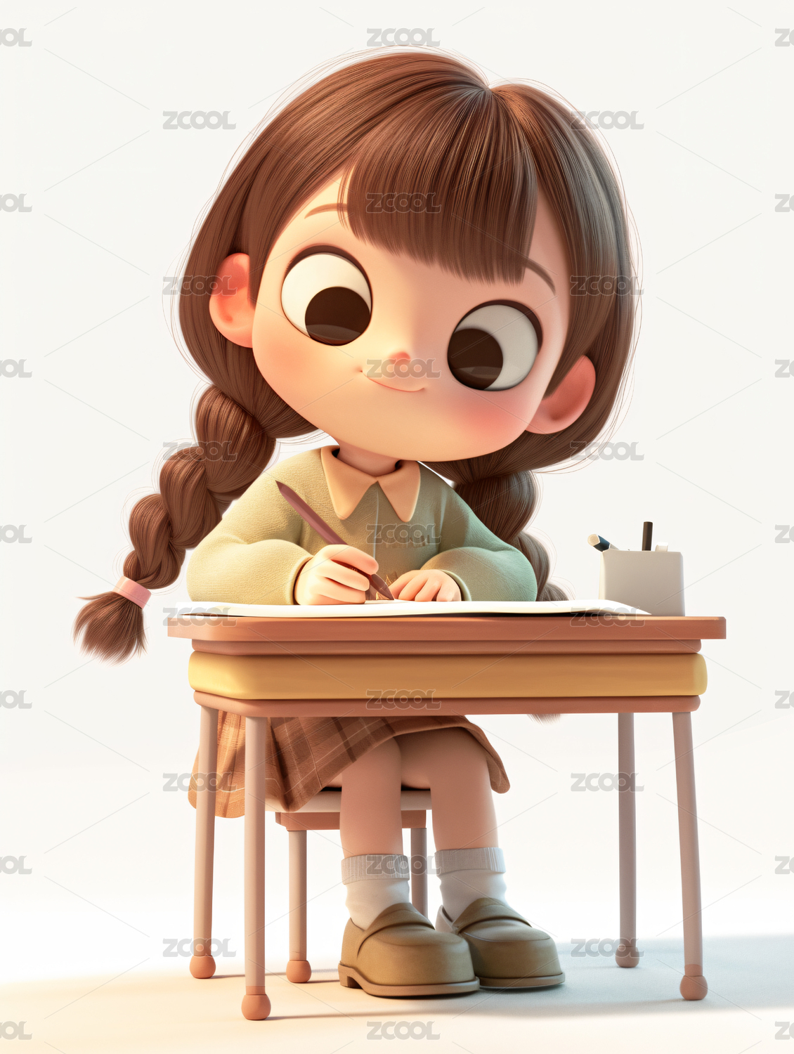 大眼睛可爱的卡通小女孩在拿着笔认真写作业