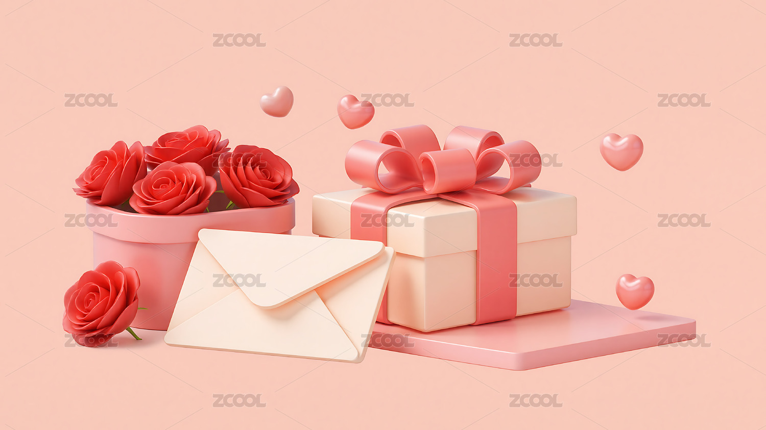 3d粉色礼物盒与玫瑰花的浪漫组合