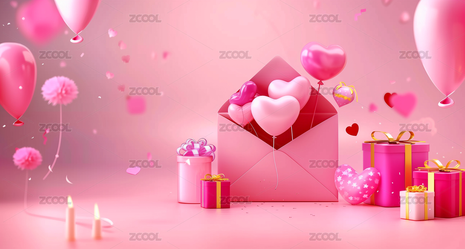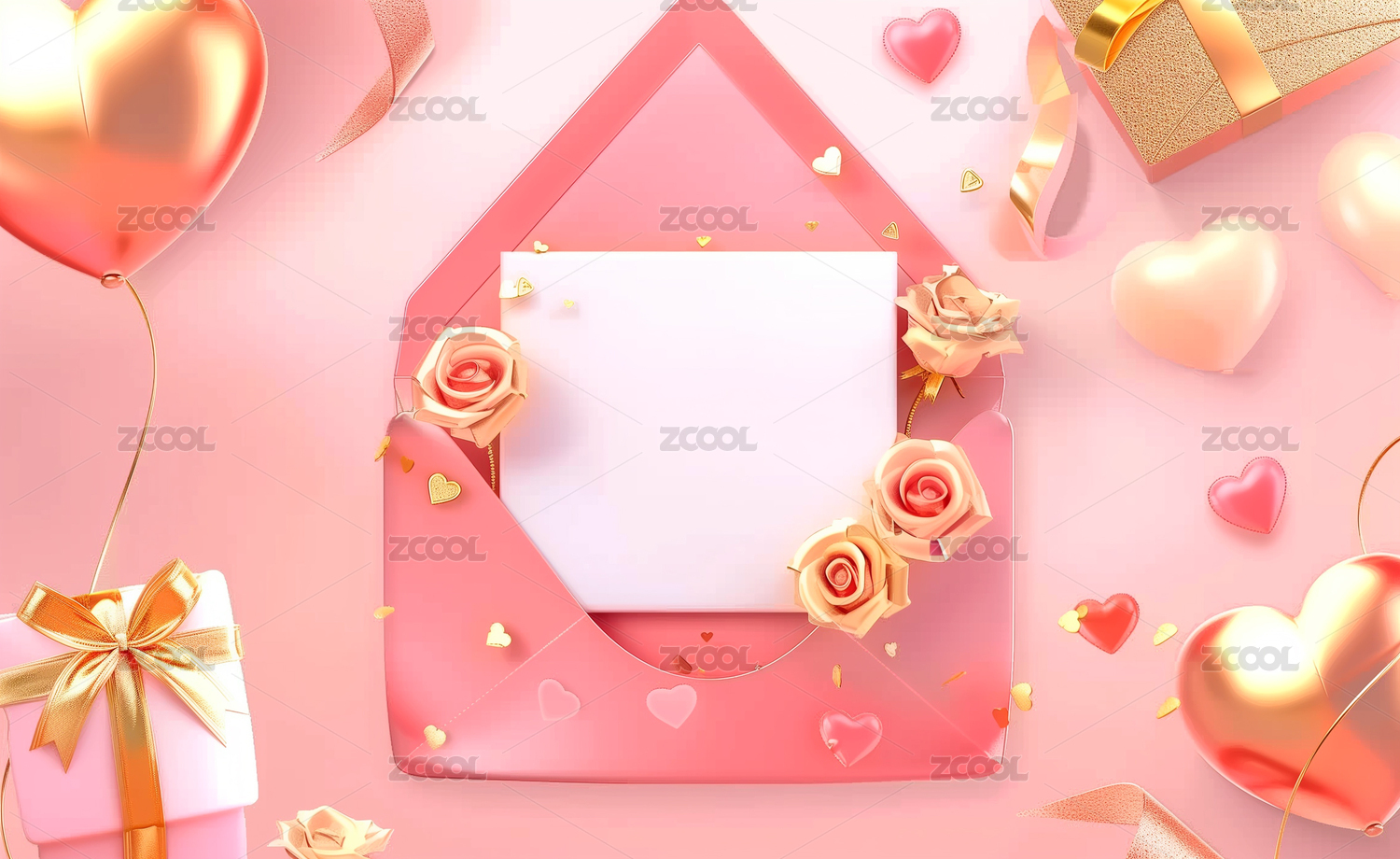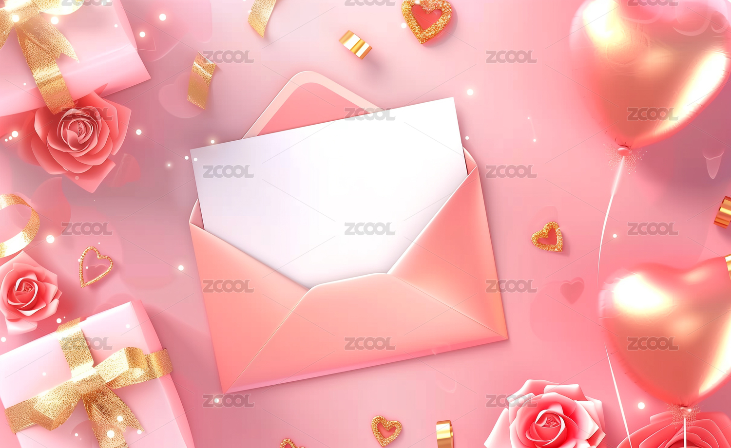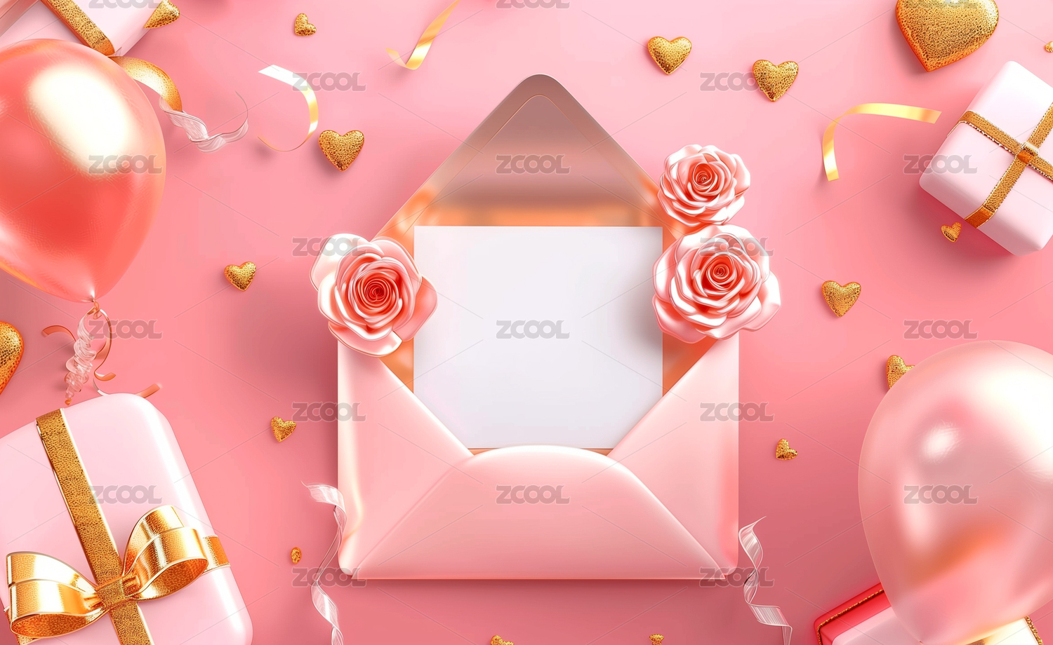 爱心,彩带,粉色,礼盒,玫瑰,气球,情人节,丝带,信封,信纸