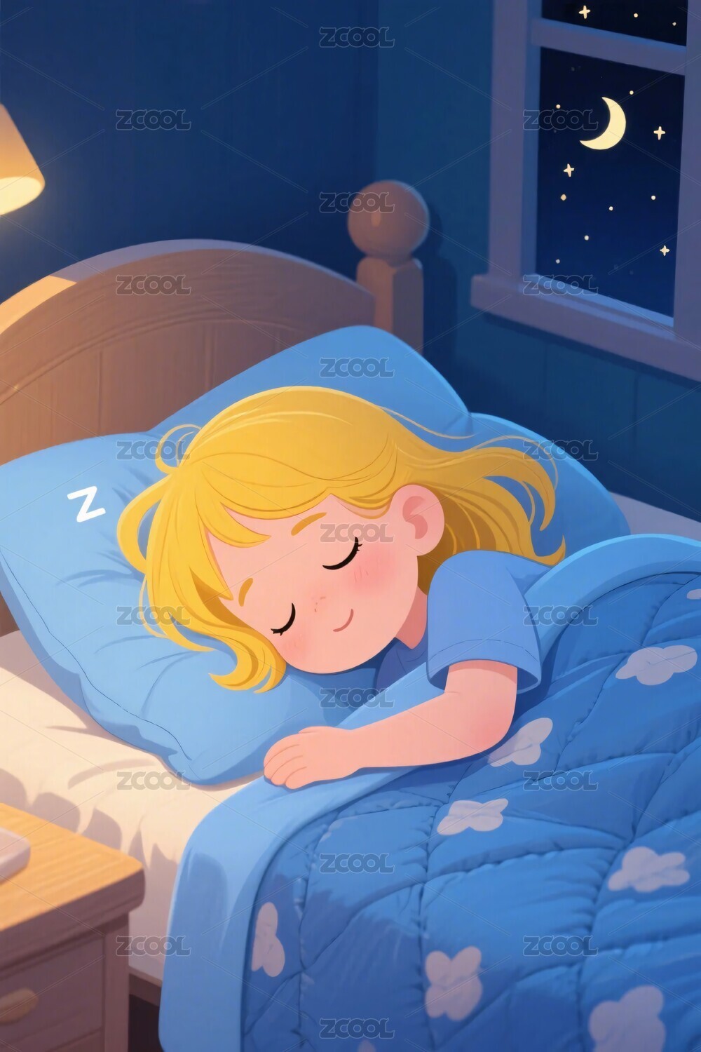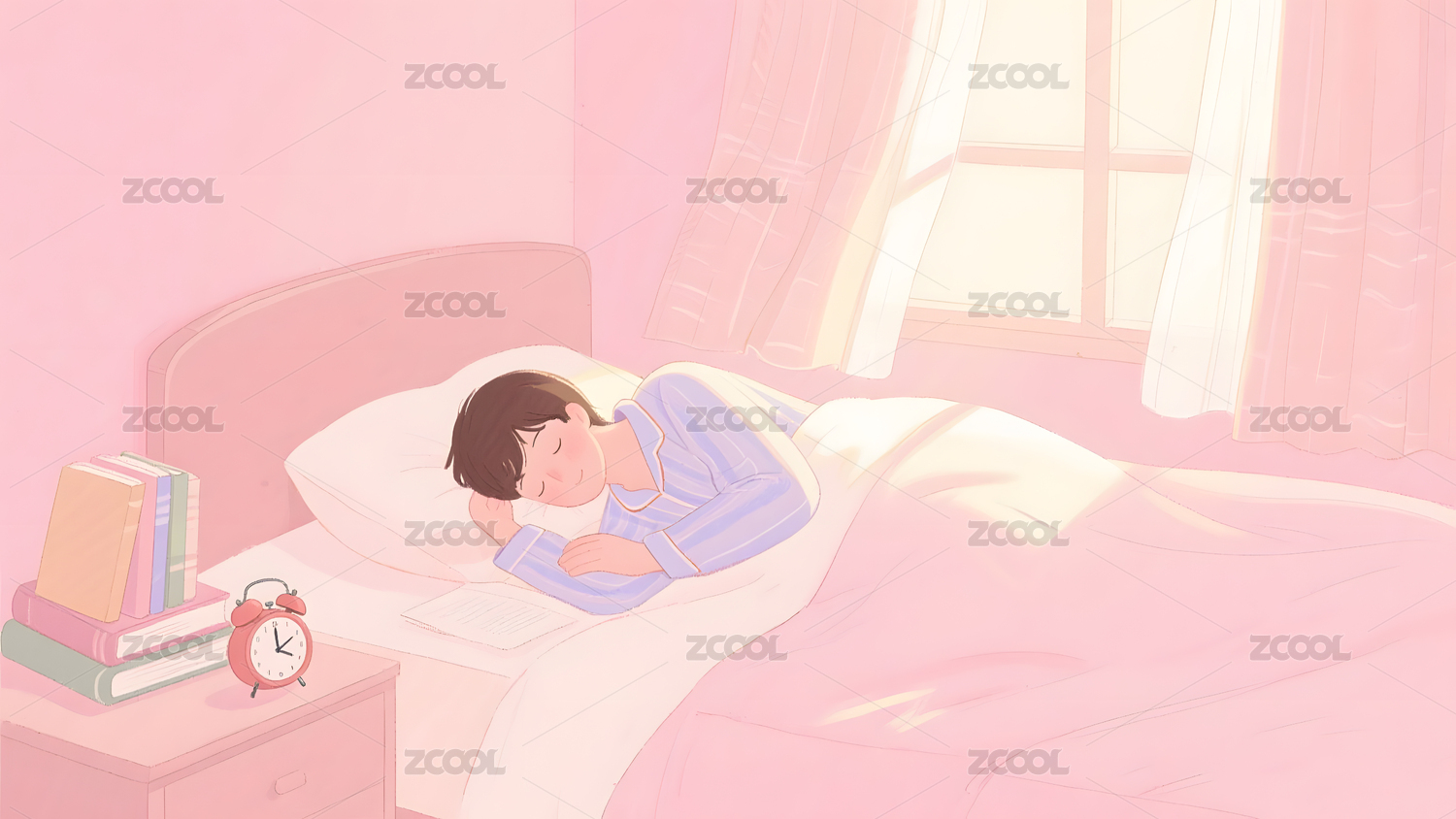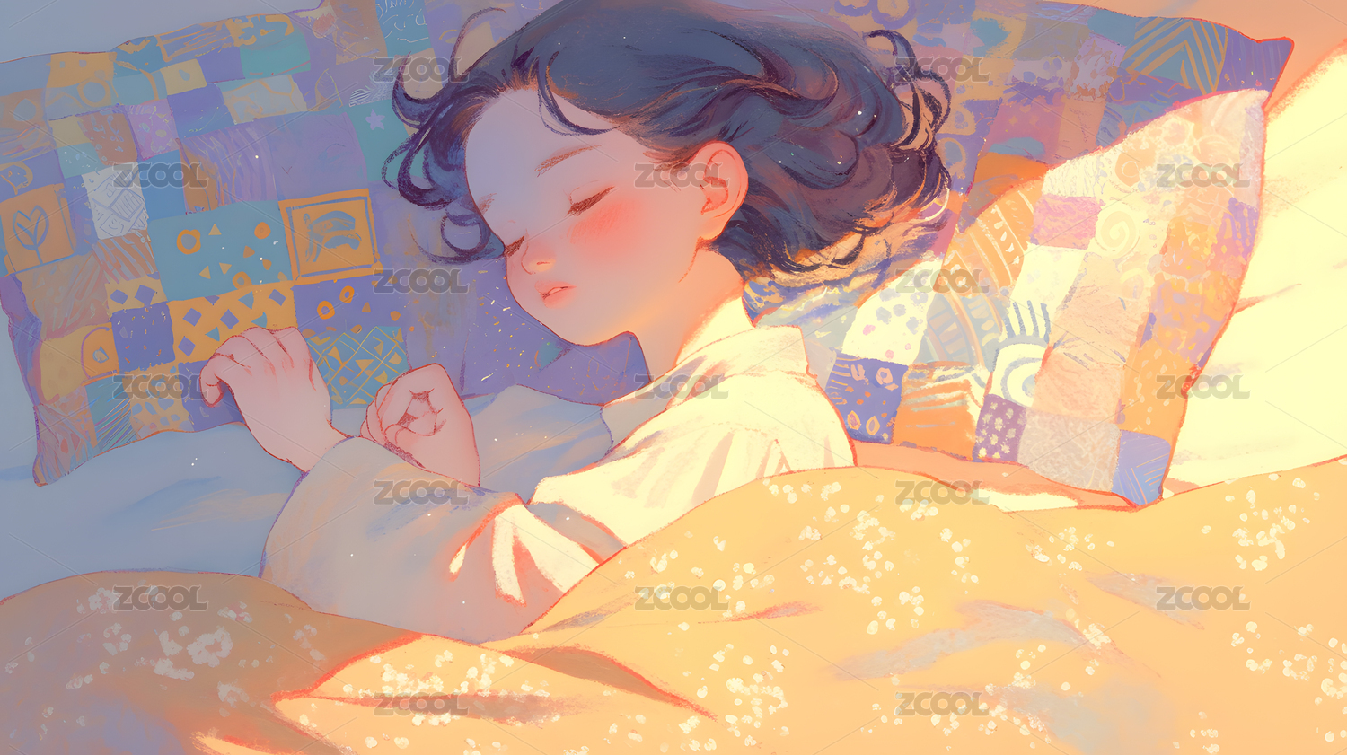 卡通,可爱,插画,阳光,温馨,早晨,舒适,女孩,睡觉,床
