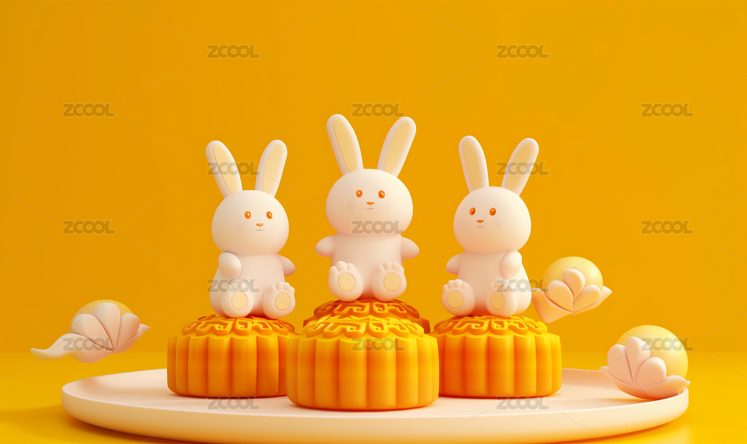 玉兔,节日,中秋节,三维立体,3D,场景,美食,可爱,月饼,黄色