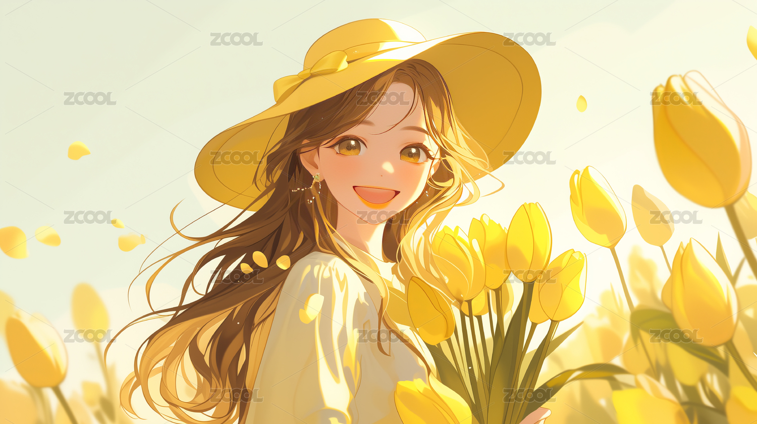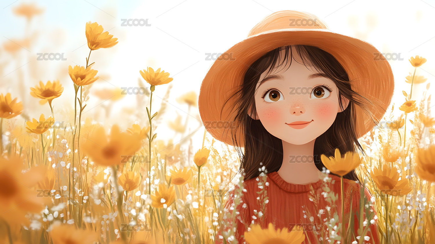 水彩,少女,田园,田野,小花,蓝天,草帽,唯美,美丽
