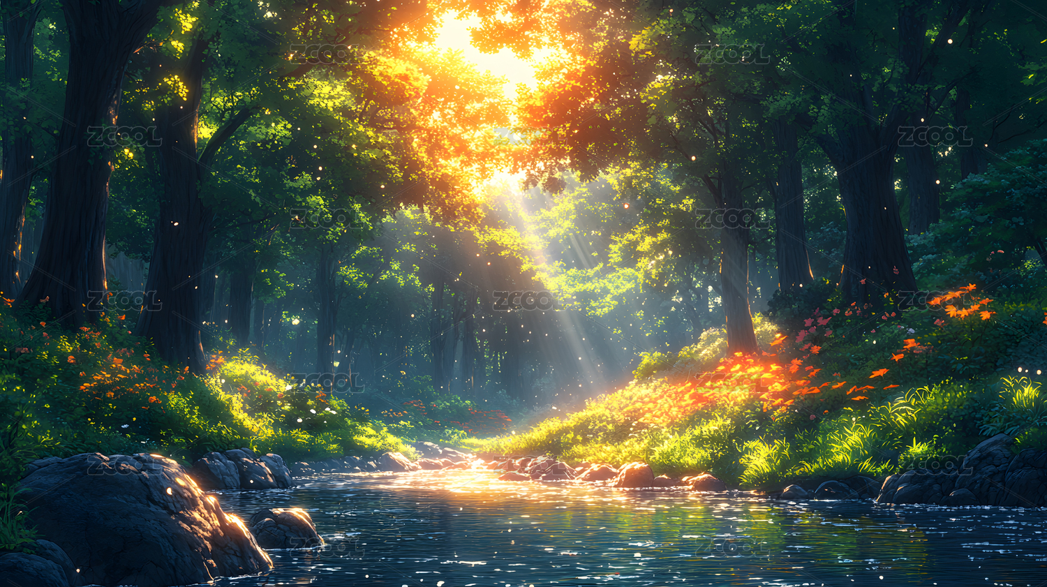 阳光透过树林洒向小溪的梦幻森林