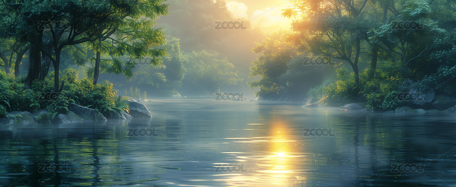 水彩风格森林溪流景观