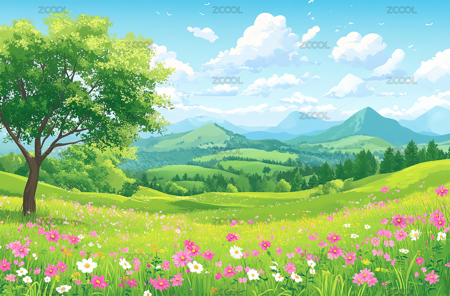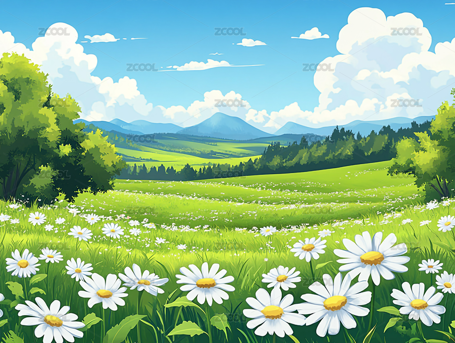 浪漫唯美晴朗的户外绿地风景插画