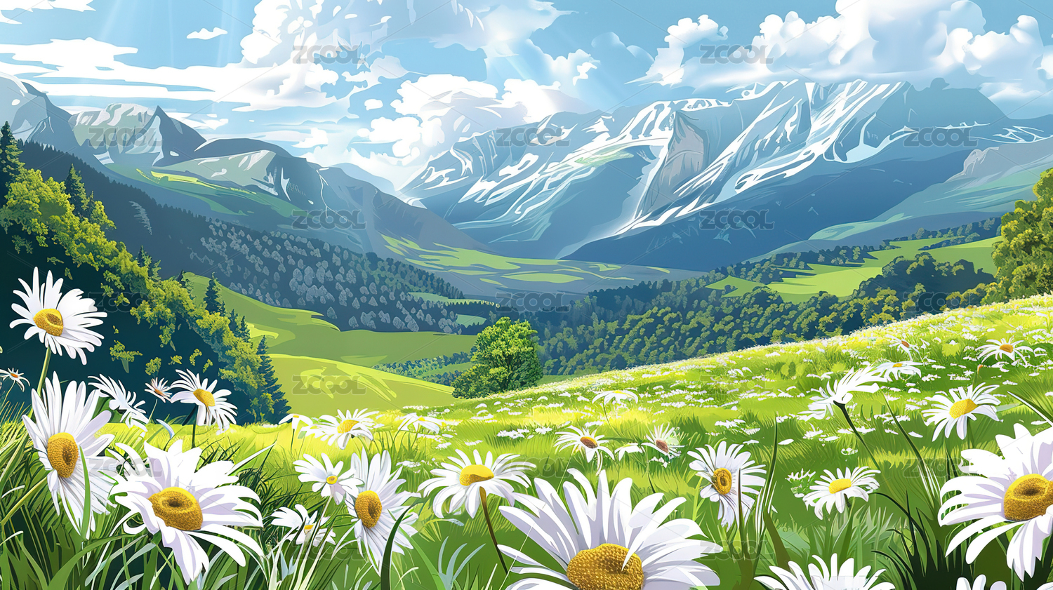 山间雏菊花海的宁静油画风景