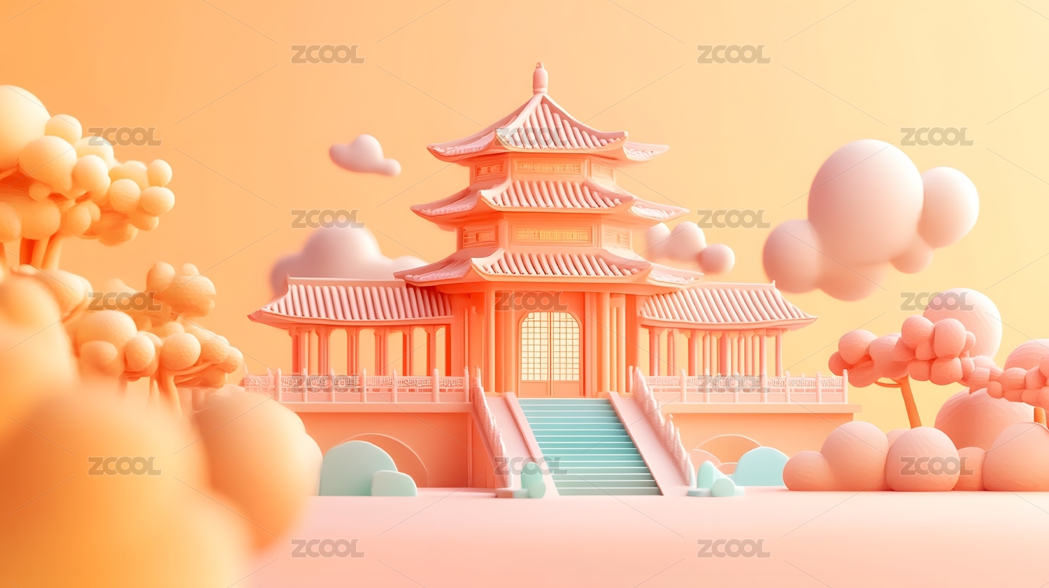 国风意境的古建筑3D渲染插画