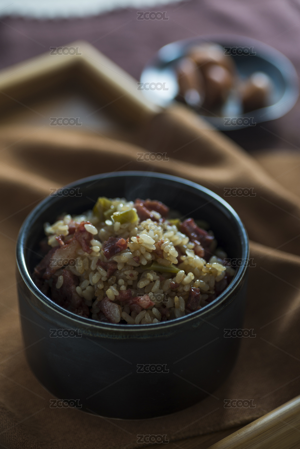 黑色背景上一碗中式腊肠米饭和木筷俯视近景