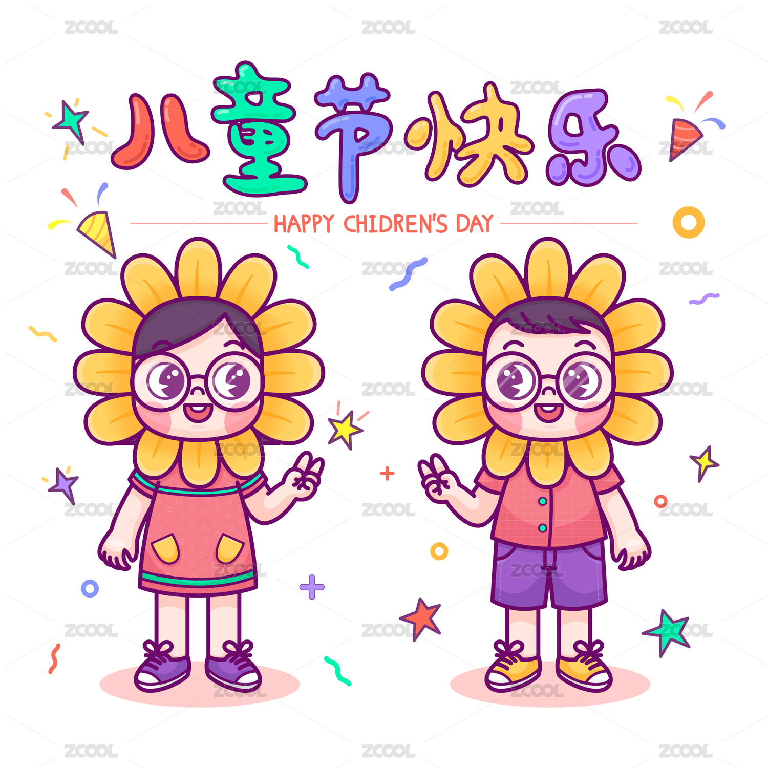 儿童节快乐主题插画 头戴太阳花的男孩女孩