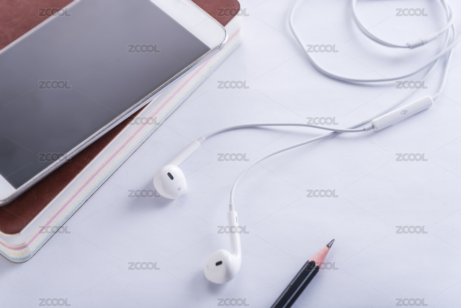 桌面上放着手机和耳机