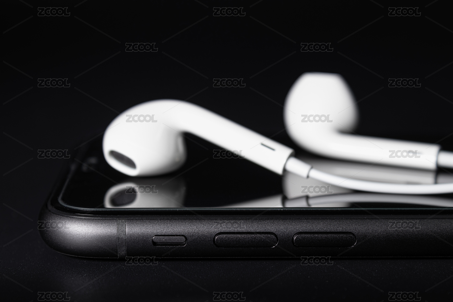 耳机放在手机屏幕上,背景是黑色