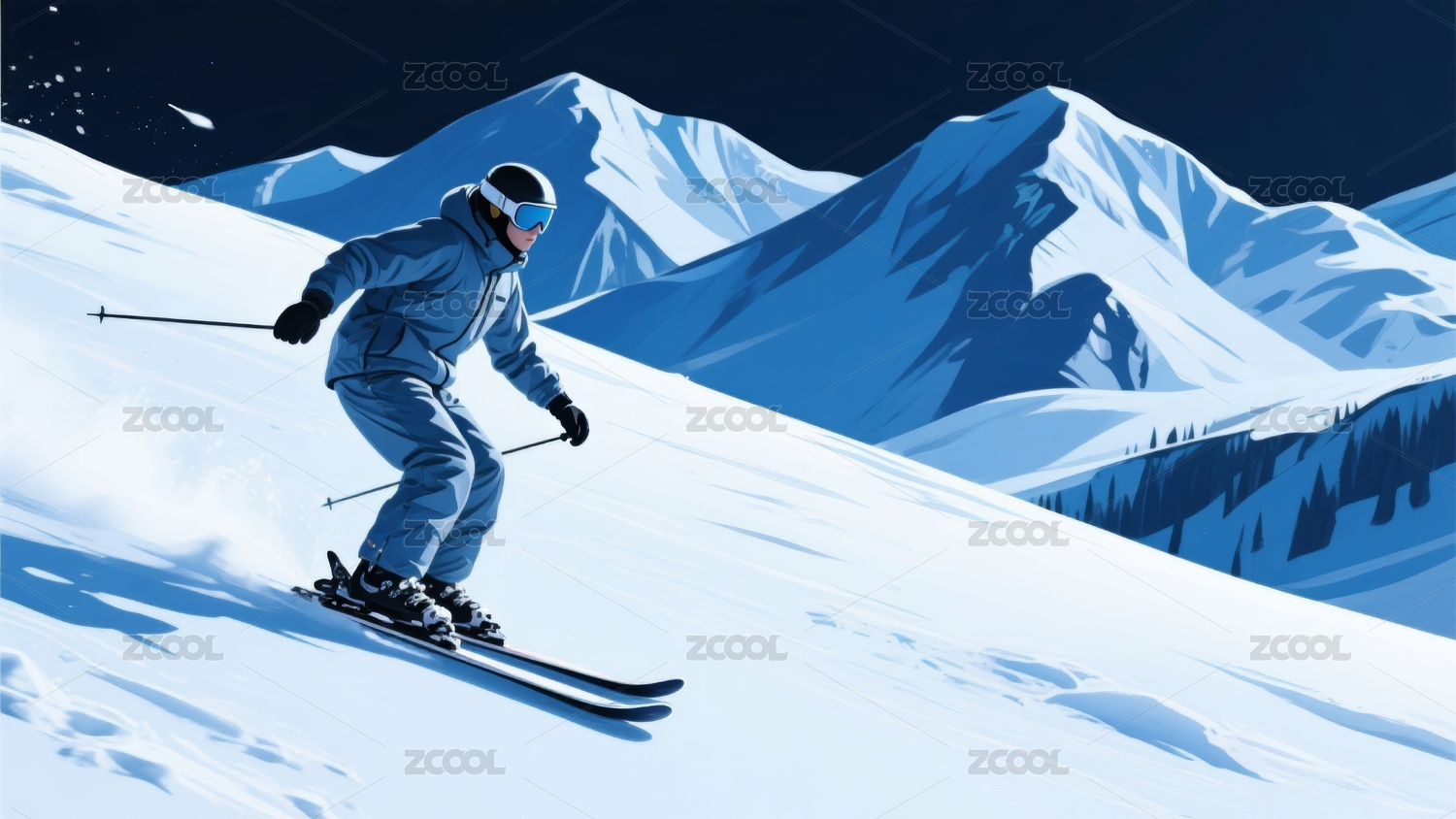 卡通风格滑雪运动员在雪坡上滑行滑雪,运动