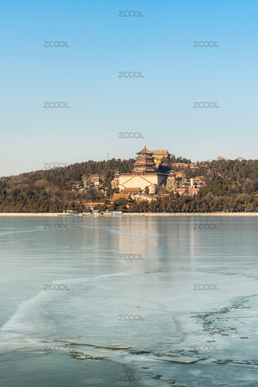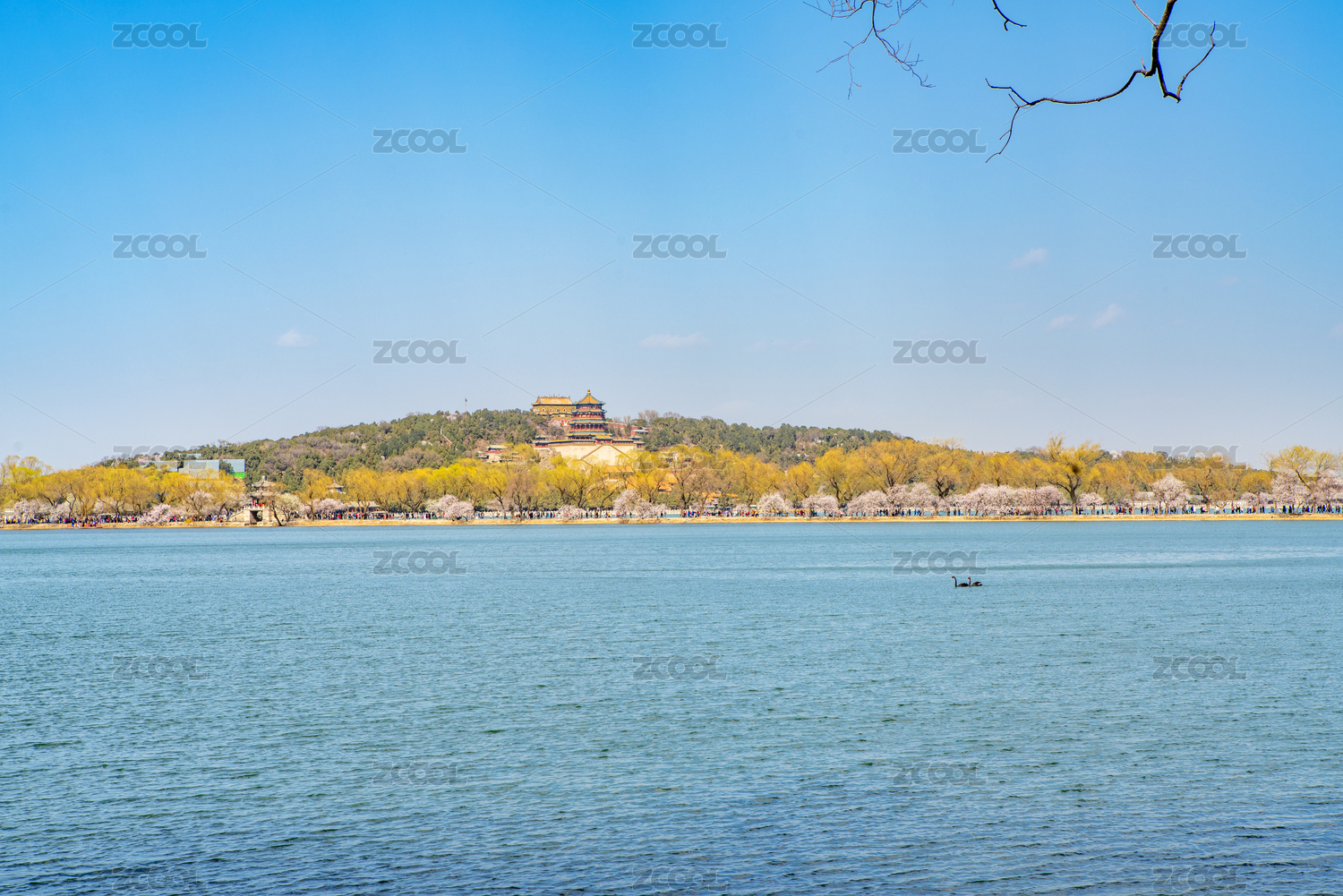 北京颐和园公园春季桃花湖水西堤传统古建筑