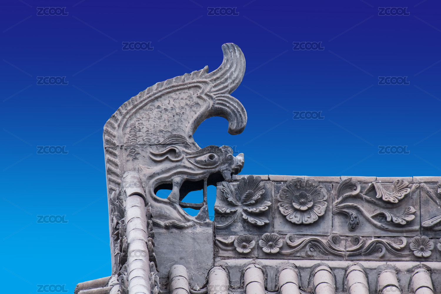 建筑,古代,屋檐,雕刻,屋脊,兽头,青瓦,白昼,古代建筑,蓝天
