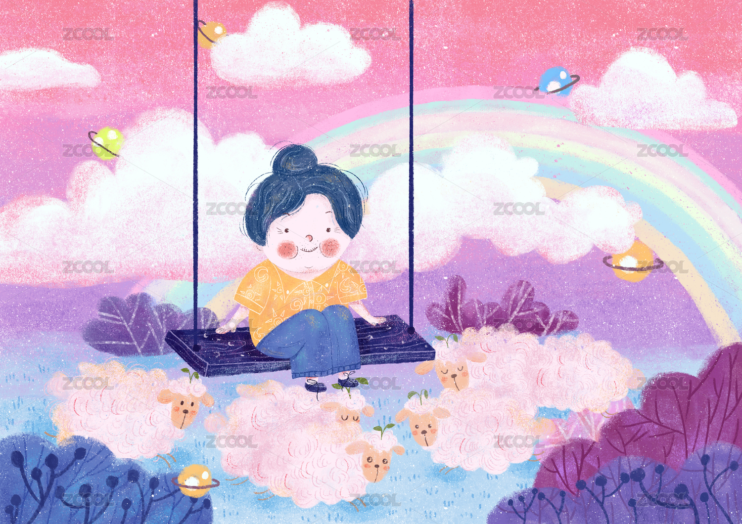 老奶奶在有彩虹的地方和一群羊一起汤秋千