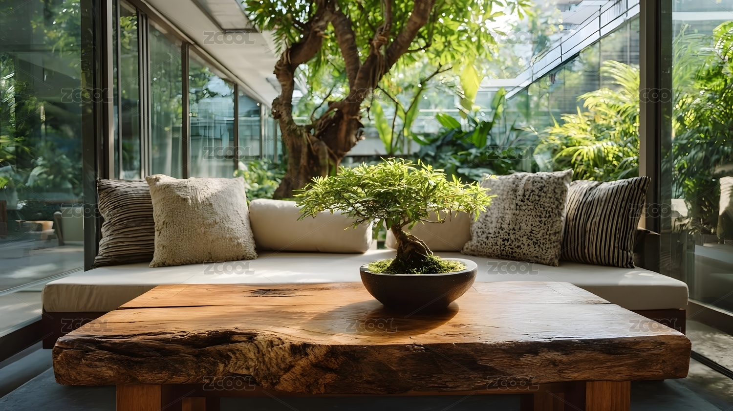 中国香港室内环绕着绿色植物的餐厅桌椅座位