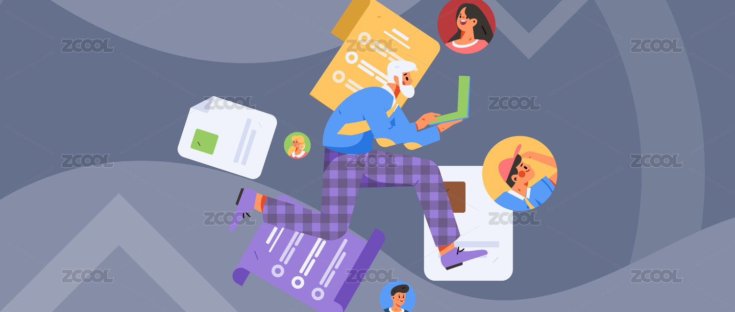 办公桌边 使用电脑办公聊天的加班的白领矢量海报插画背景坐在有飘窗的房间的办公桌前 使用电脑办公聊天的加班的白领矢量海报插画背景