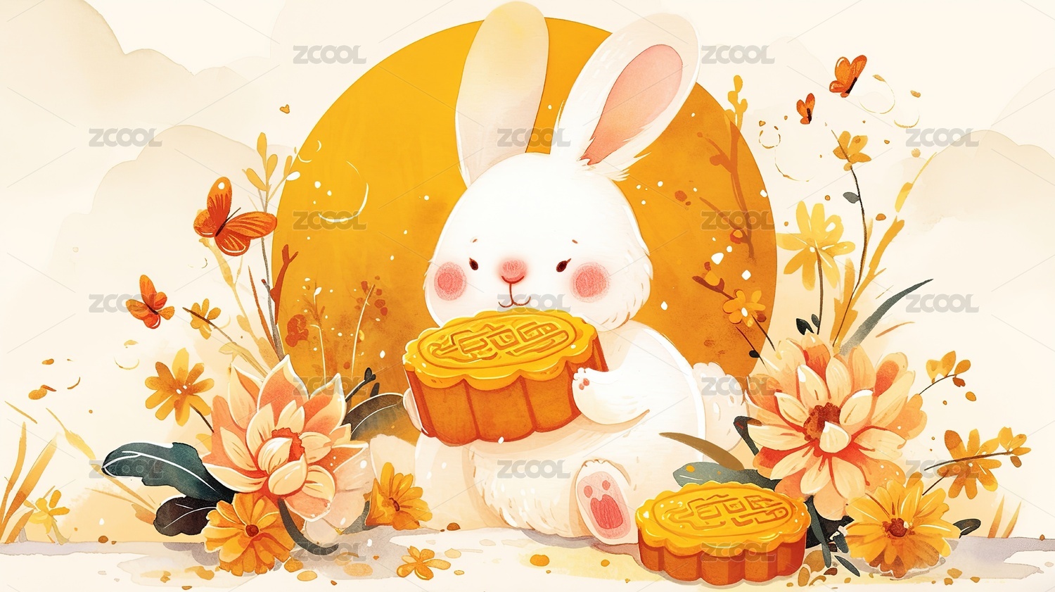 中秋节满月背景下正在吃月饼的可爱玉兔