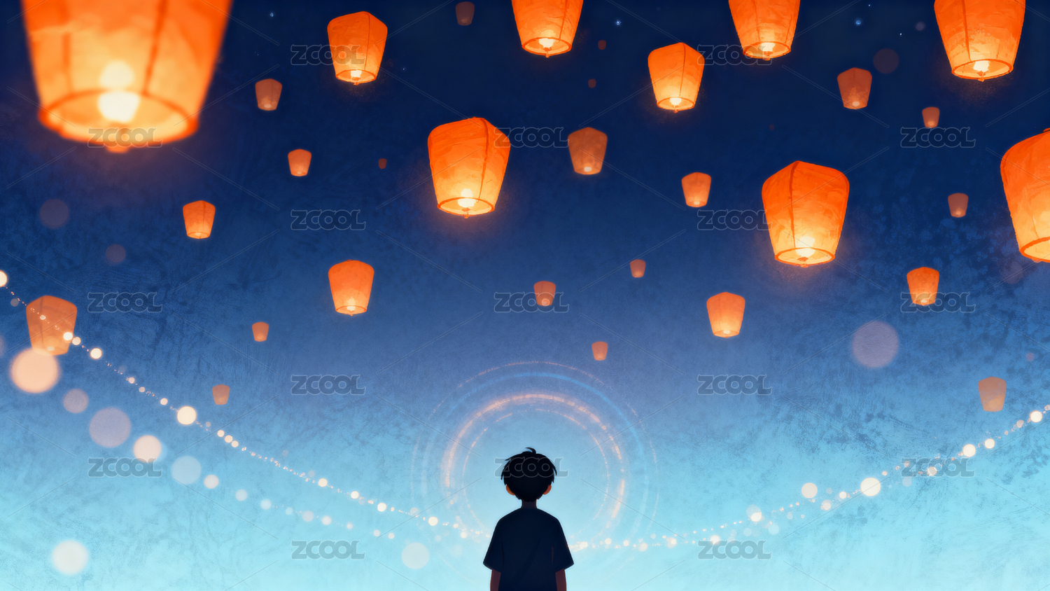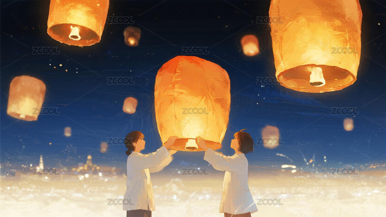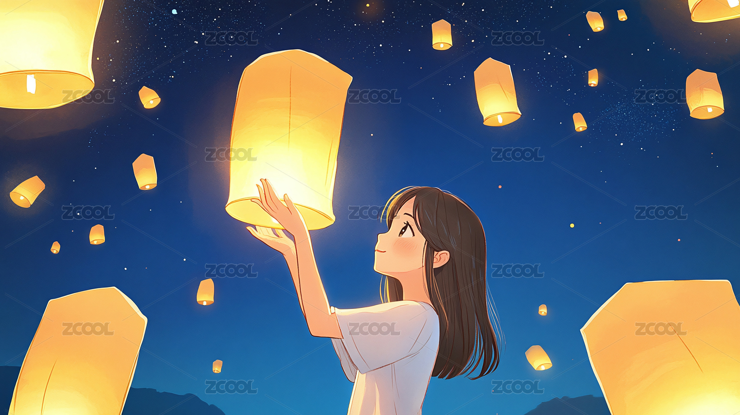 孔明灯,夜晚,中秋节,漂浮,飞升,天空,女孩,夜景,衣服,放飞
