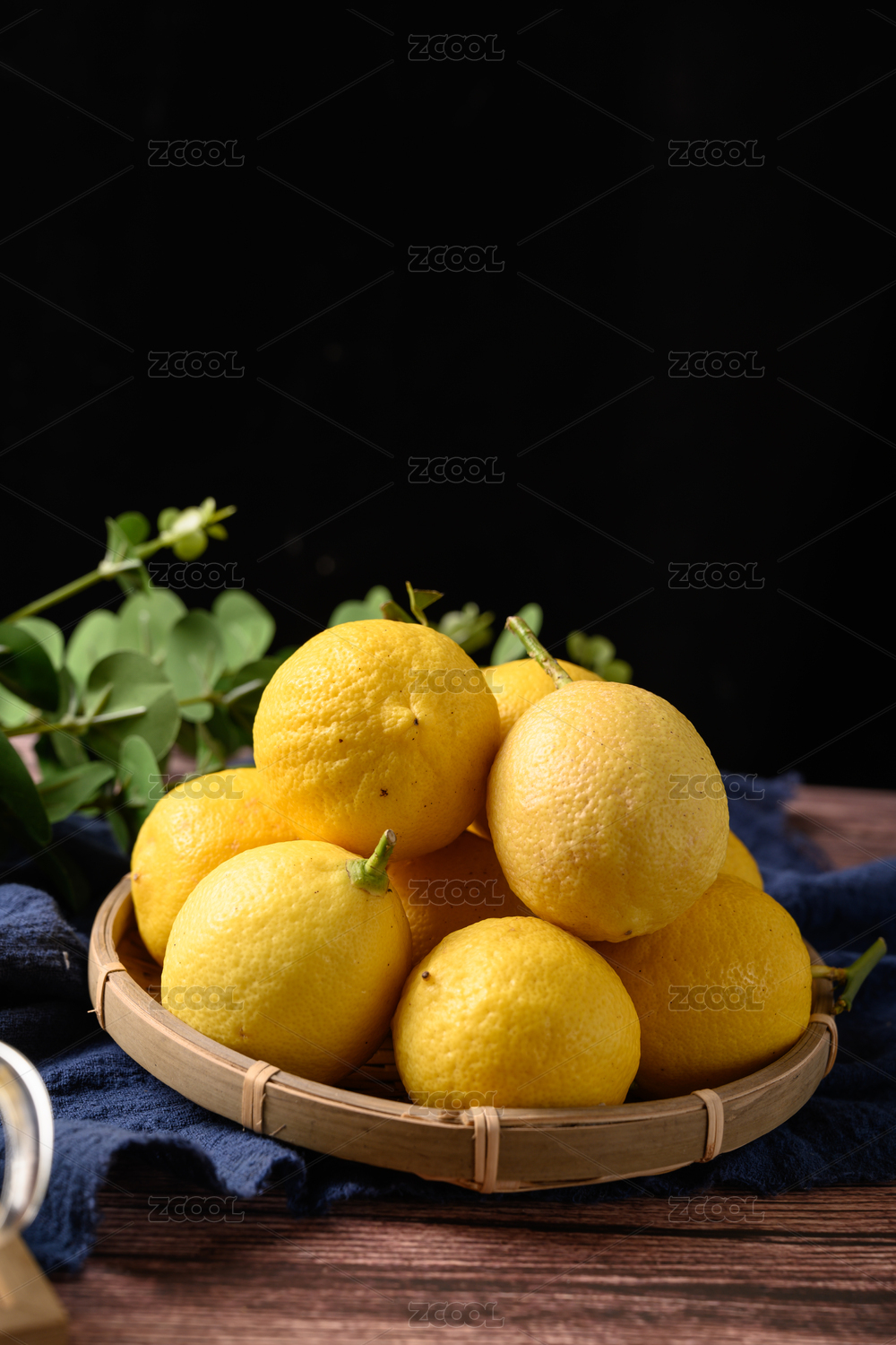 桌面上的竹簸箕上的新鲜美的的柠檬