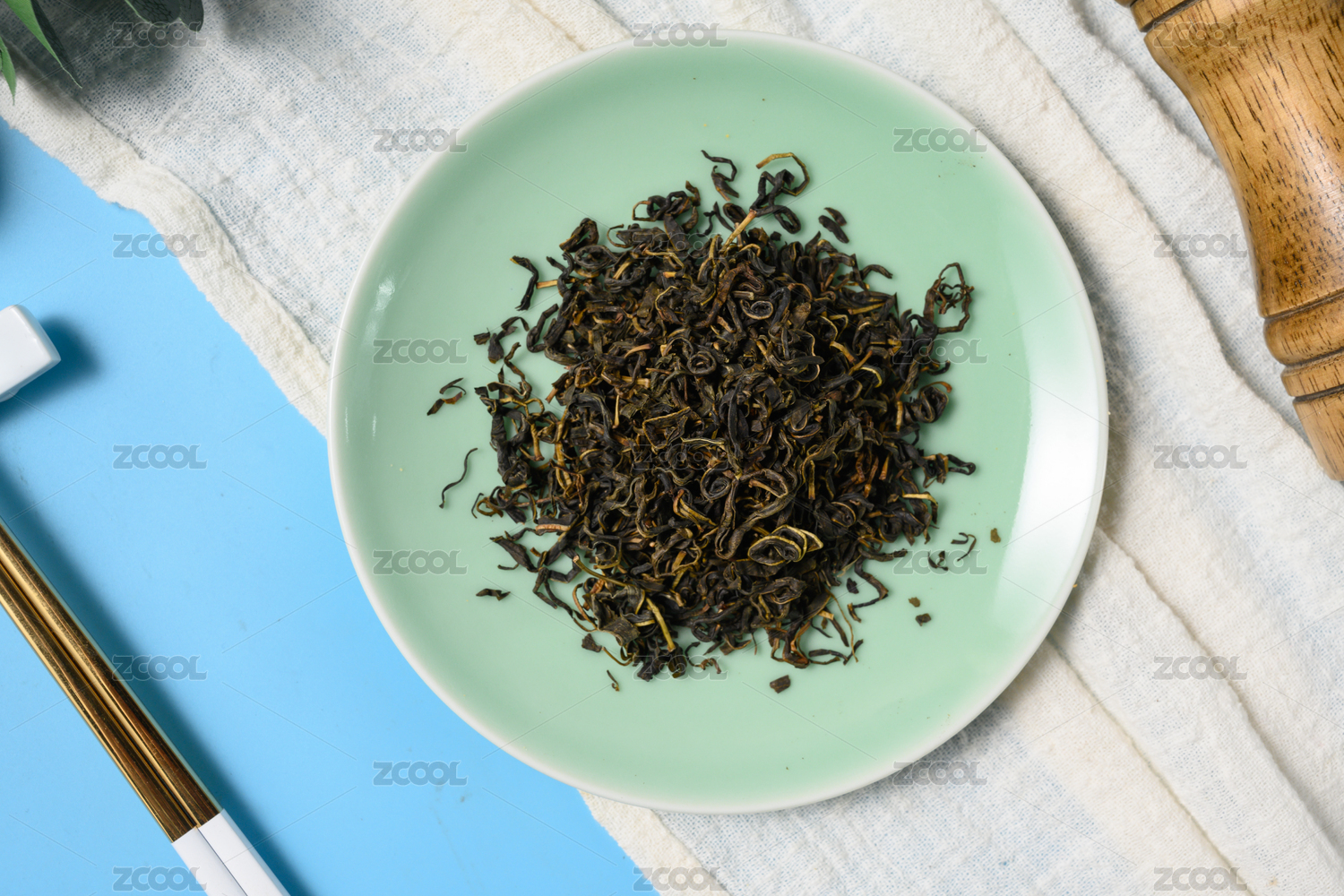 桌面上的盘子里的干爽切香气四溢的滇红金针