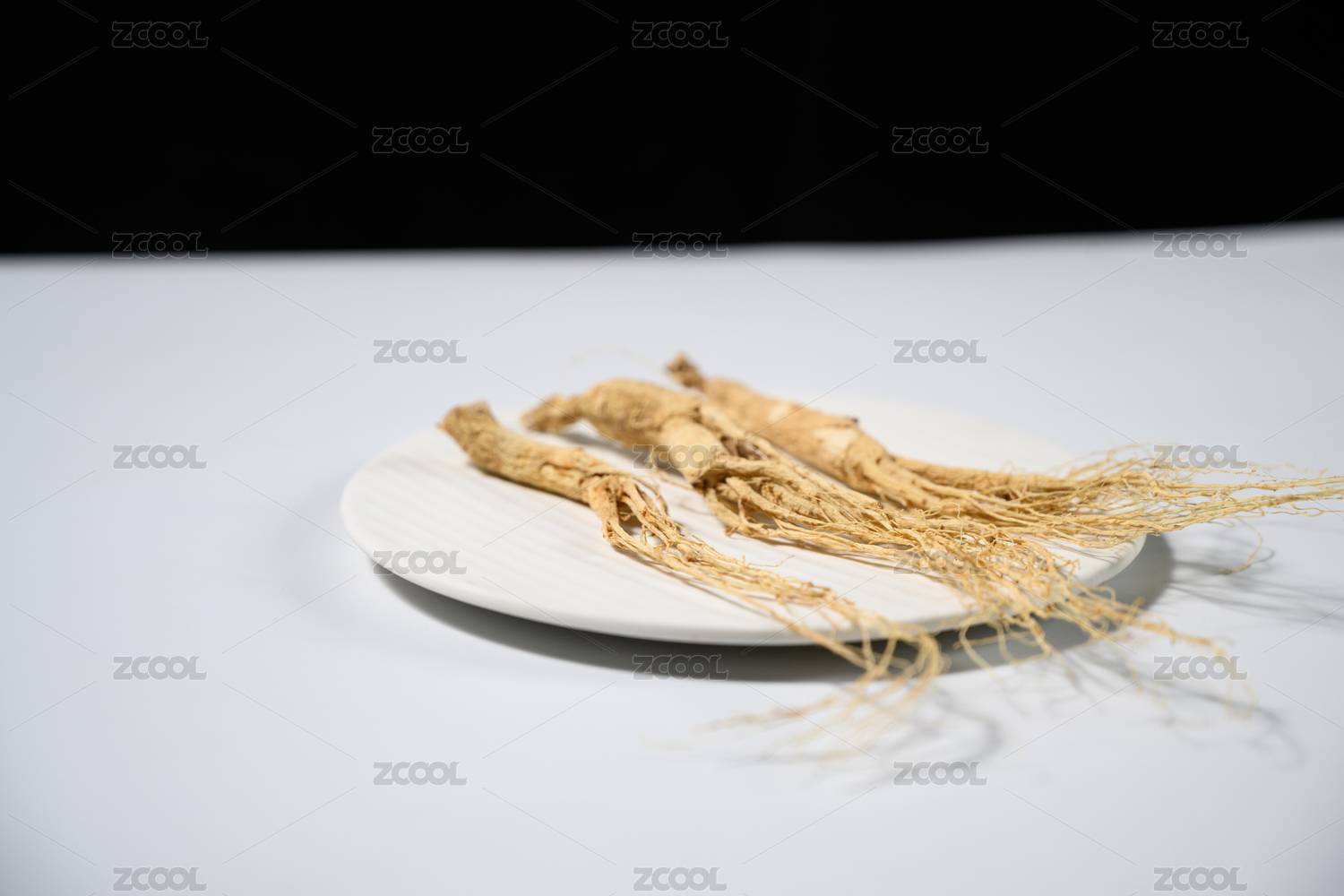 桌面上的盘子里的干爽的人参