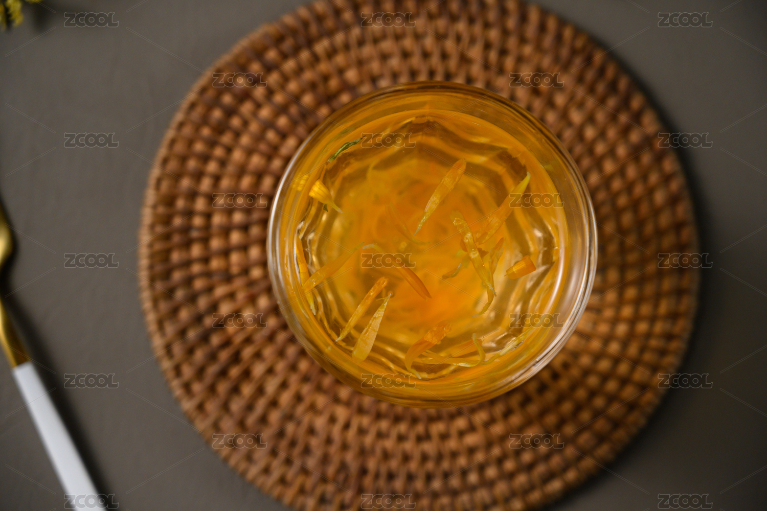桌面上的杯子里的清香四溢的金莲花茶