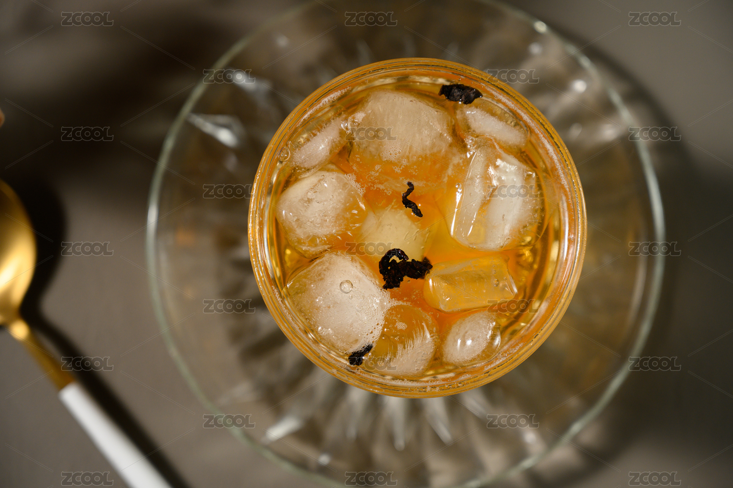 桌面上的杯子里的甘甜可口的冰咖啡果皮茶