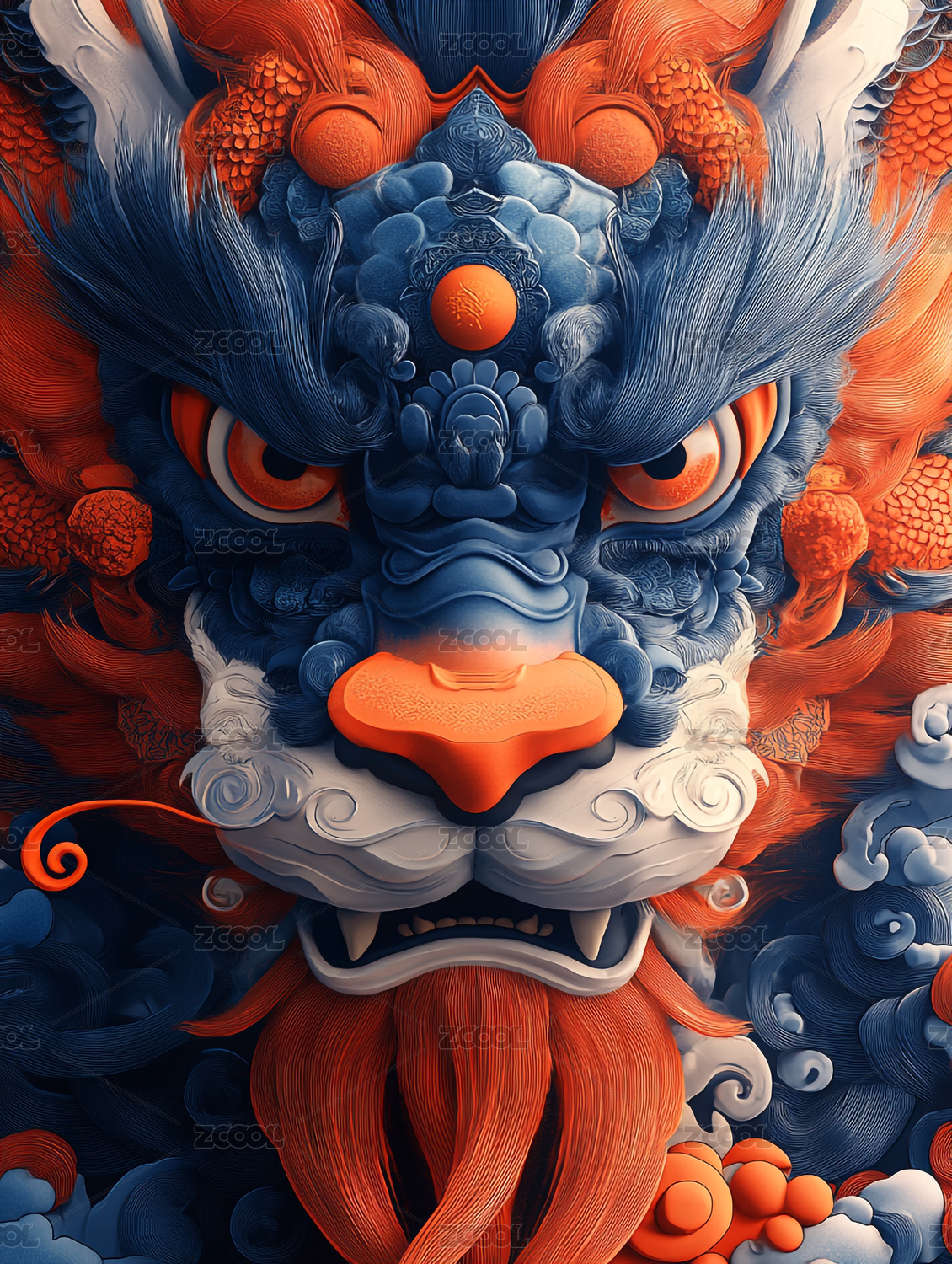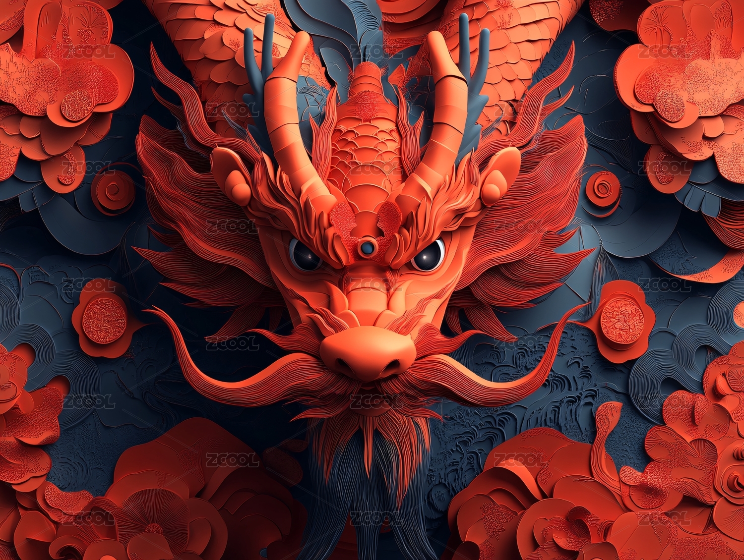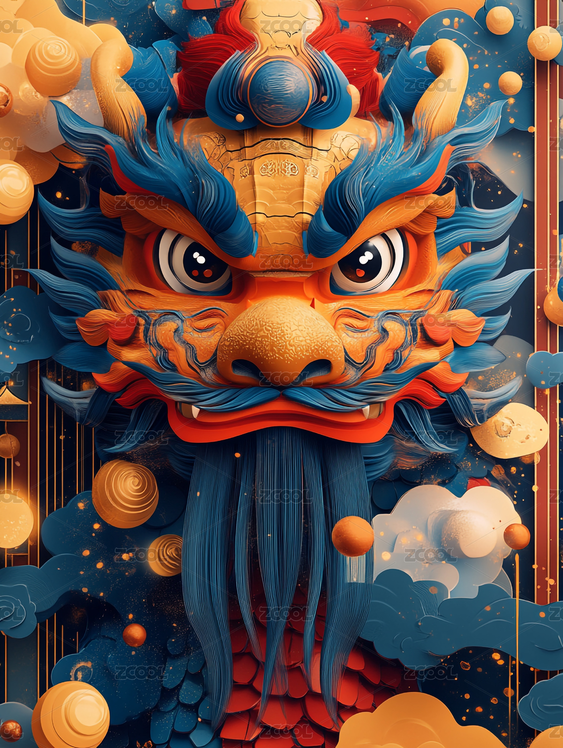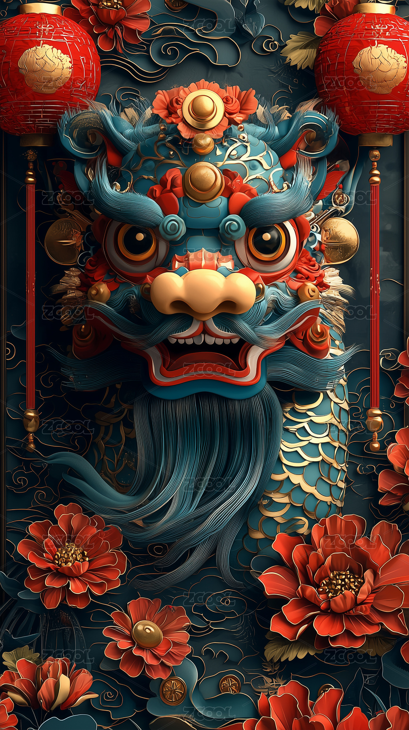 3d立体风格中国年国潮醒狮龙头壁纸插画