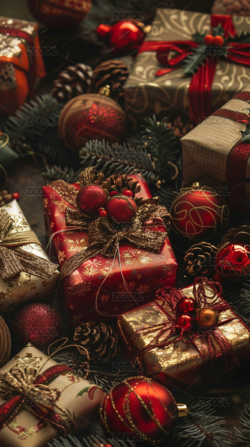 圣诞节,圣诞,圣诞树,彩灯,礼物盒,冬青叶,红果,雪花,节日,温馨