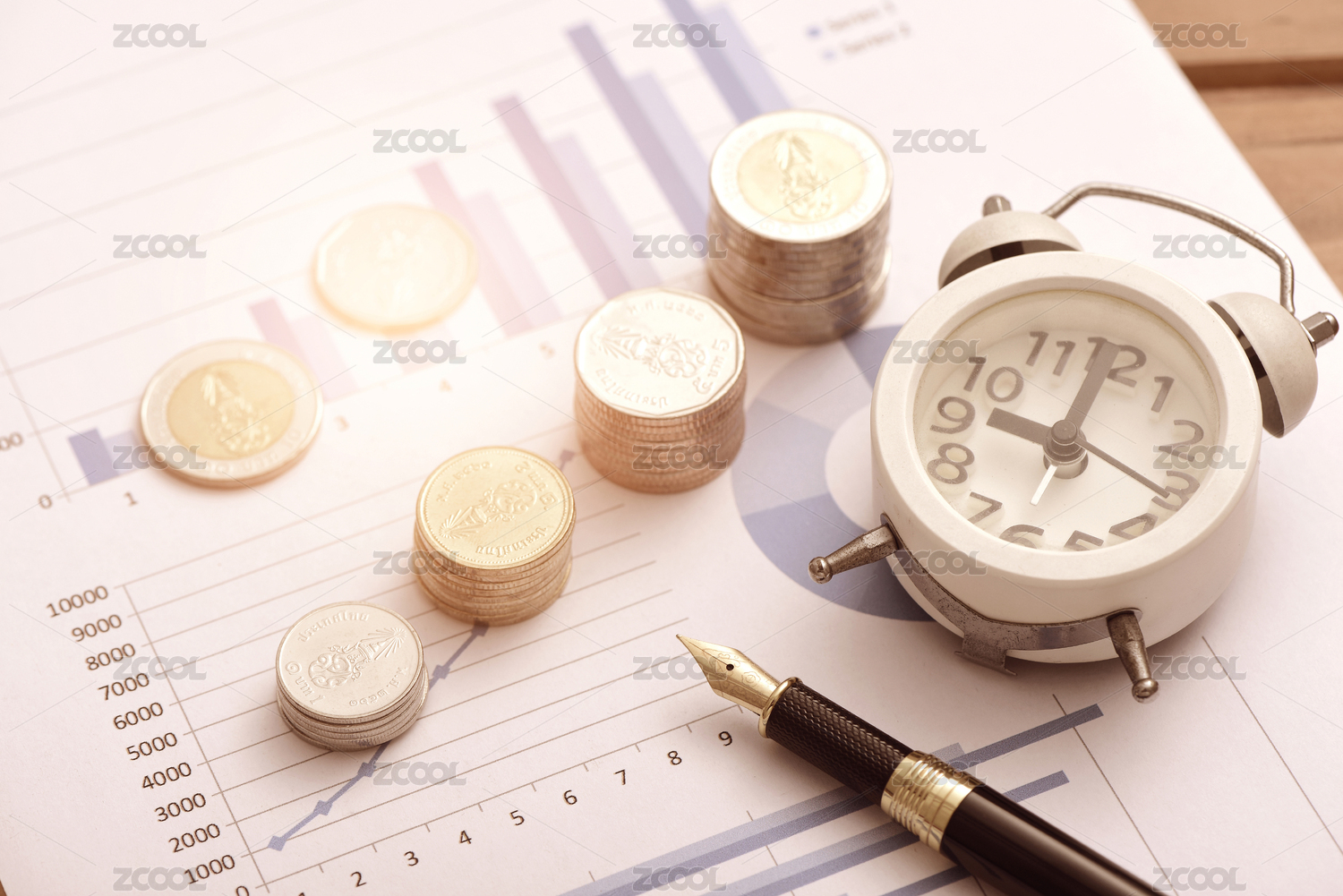 放在财务数据报表上的硬币和闹钟