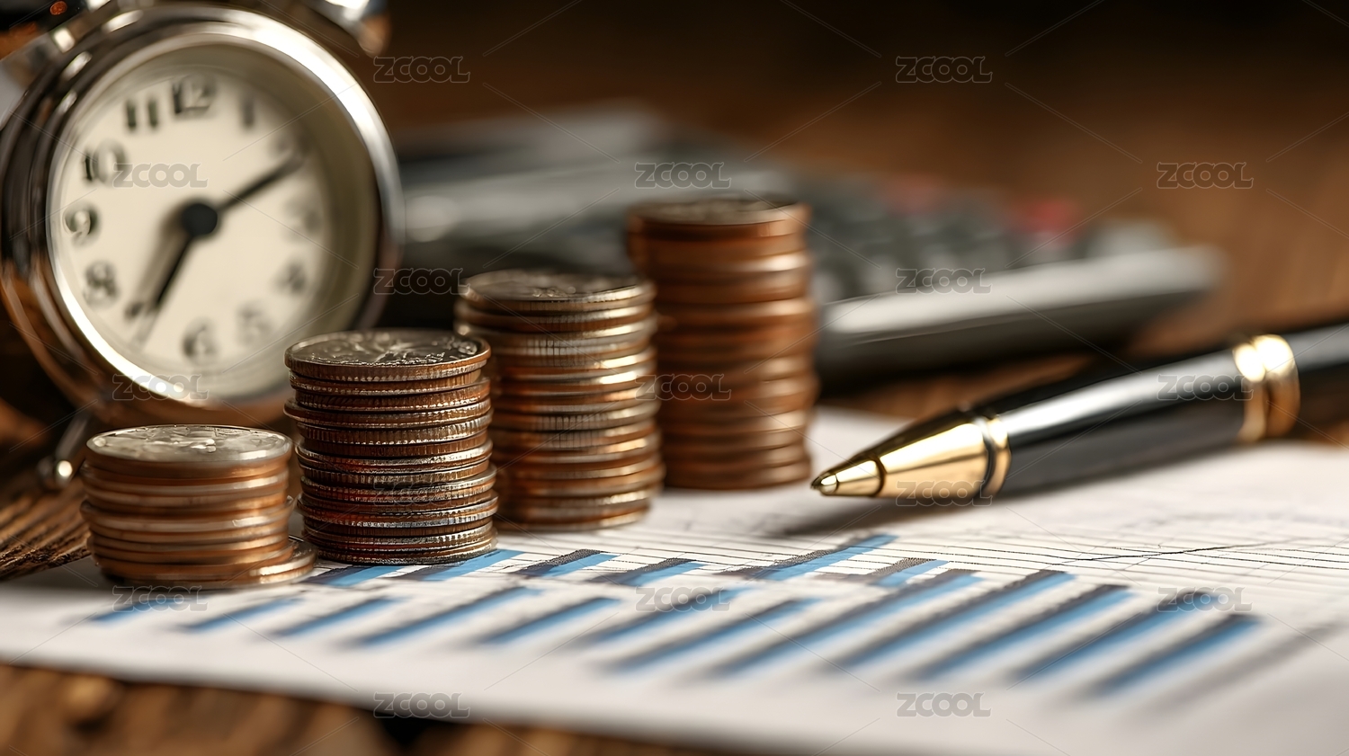 放在财务报表上的硬币、闹钟和计算器