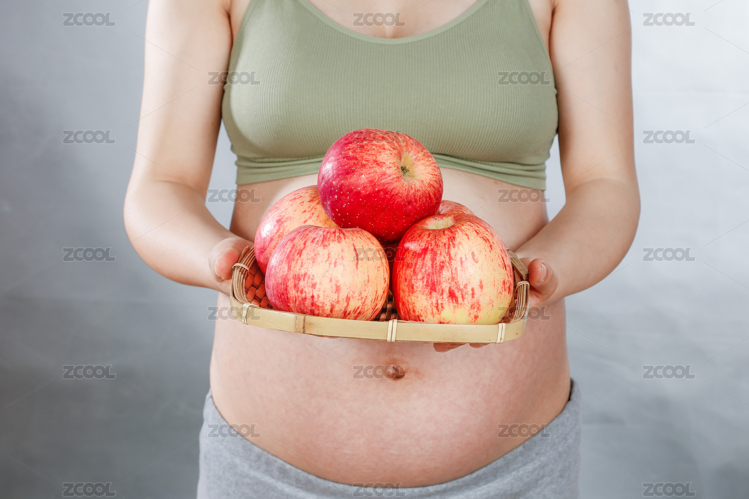 年轻的孕妇手上端着一盘苹果和吃着苹果
