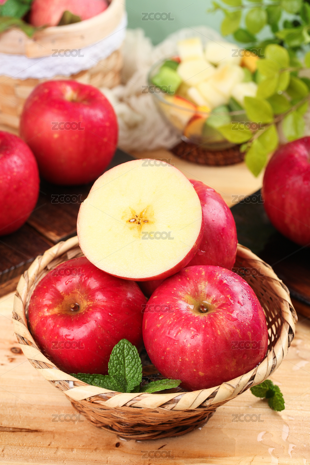 木底上蓝子里的红富士苹果和一个咬过的苹果