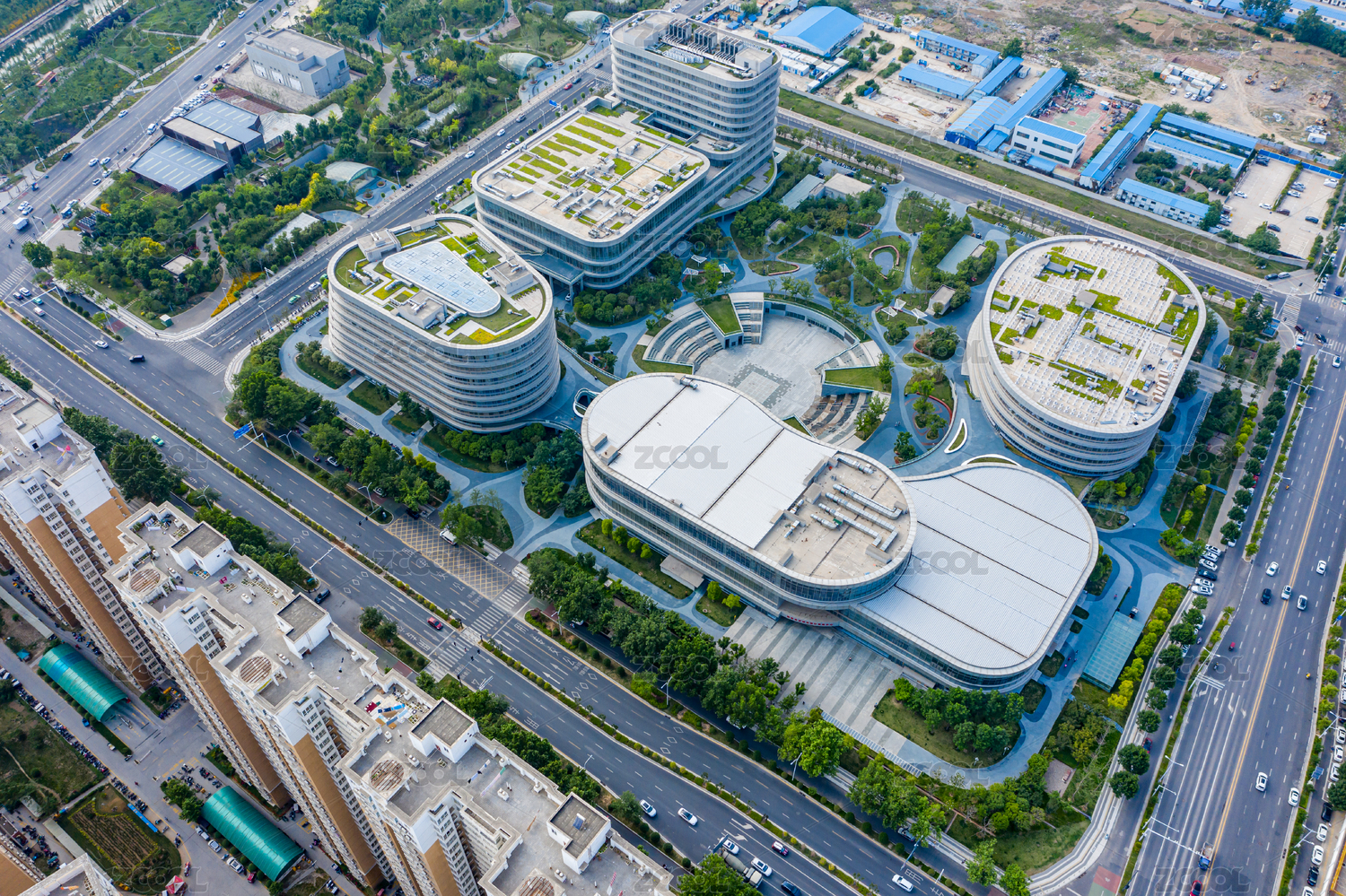 航拍河南郑州龙子湖智慧岛大厦爪子形状建筑