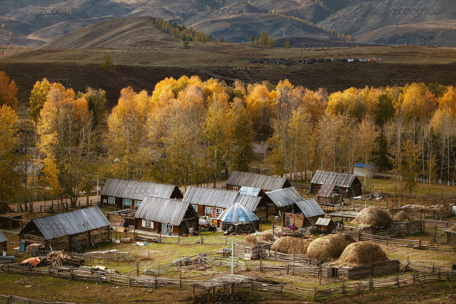 中国新疆喀纳斯原生态乡村小木屋秋色风光