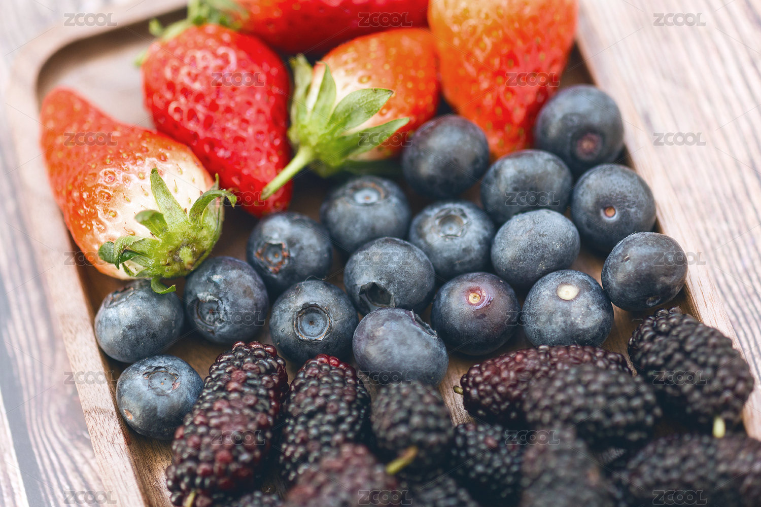 装满在水果盘的红草莓、蓝莓和樱桃特写