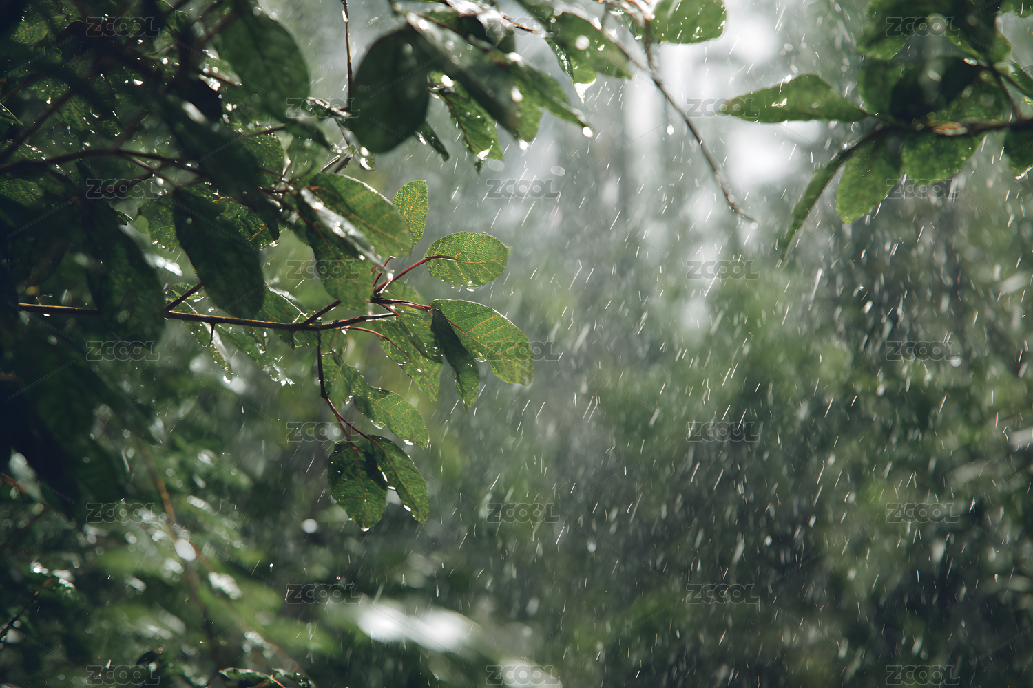 大雨中森林绿叶沾满水滴雨水雨滴植物新生