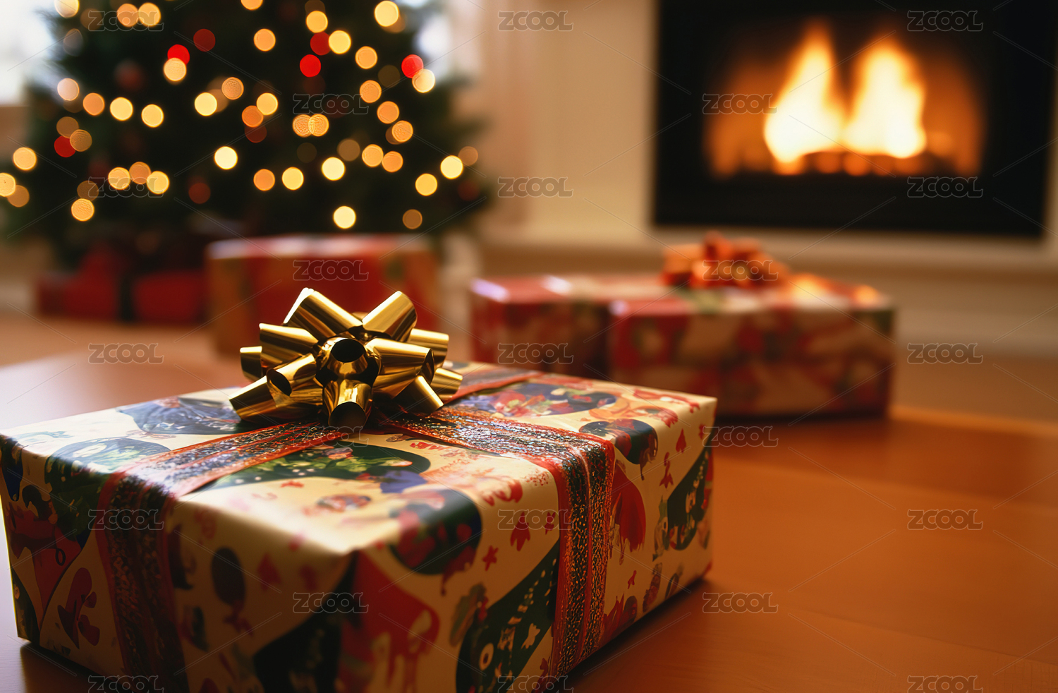 圣诞节室内圣诞树礼盒和燃烧的壁炉