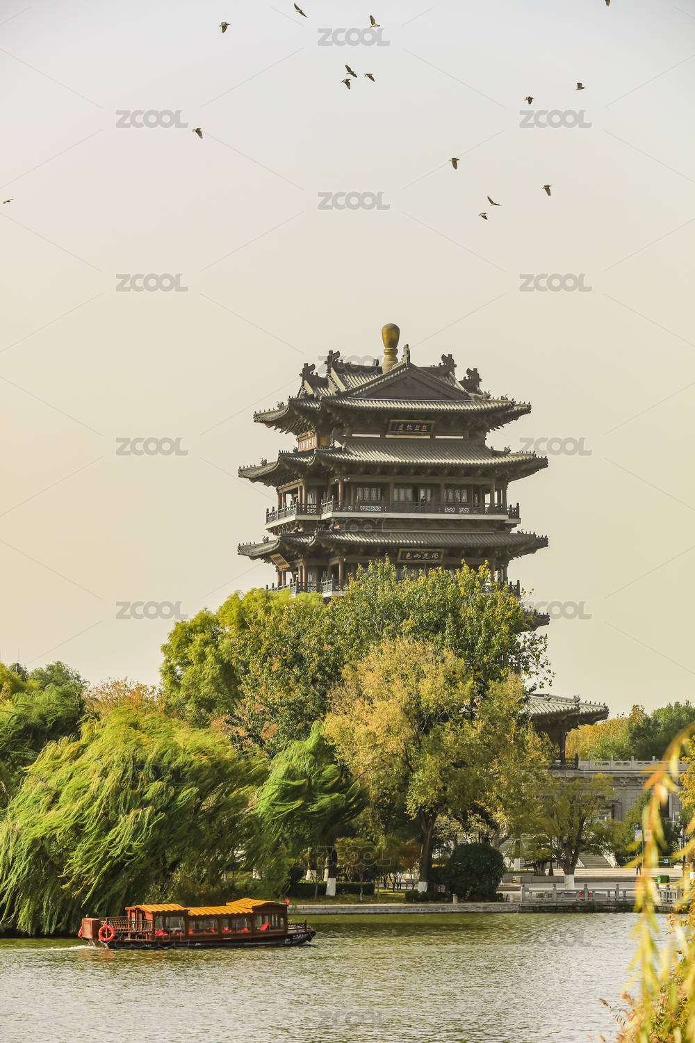 鸟儿在大明湖超然楼上空飞翔