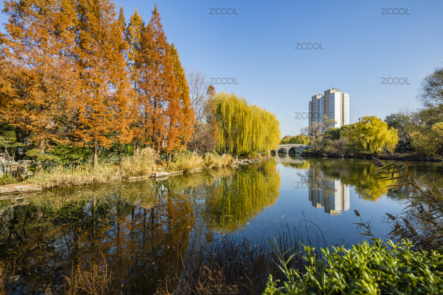 秋季中国沈阳公园户外池塘树林天鹅野鸭