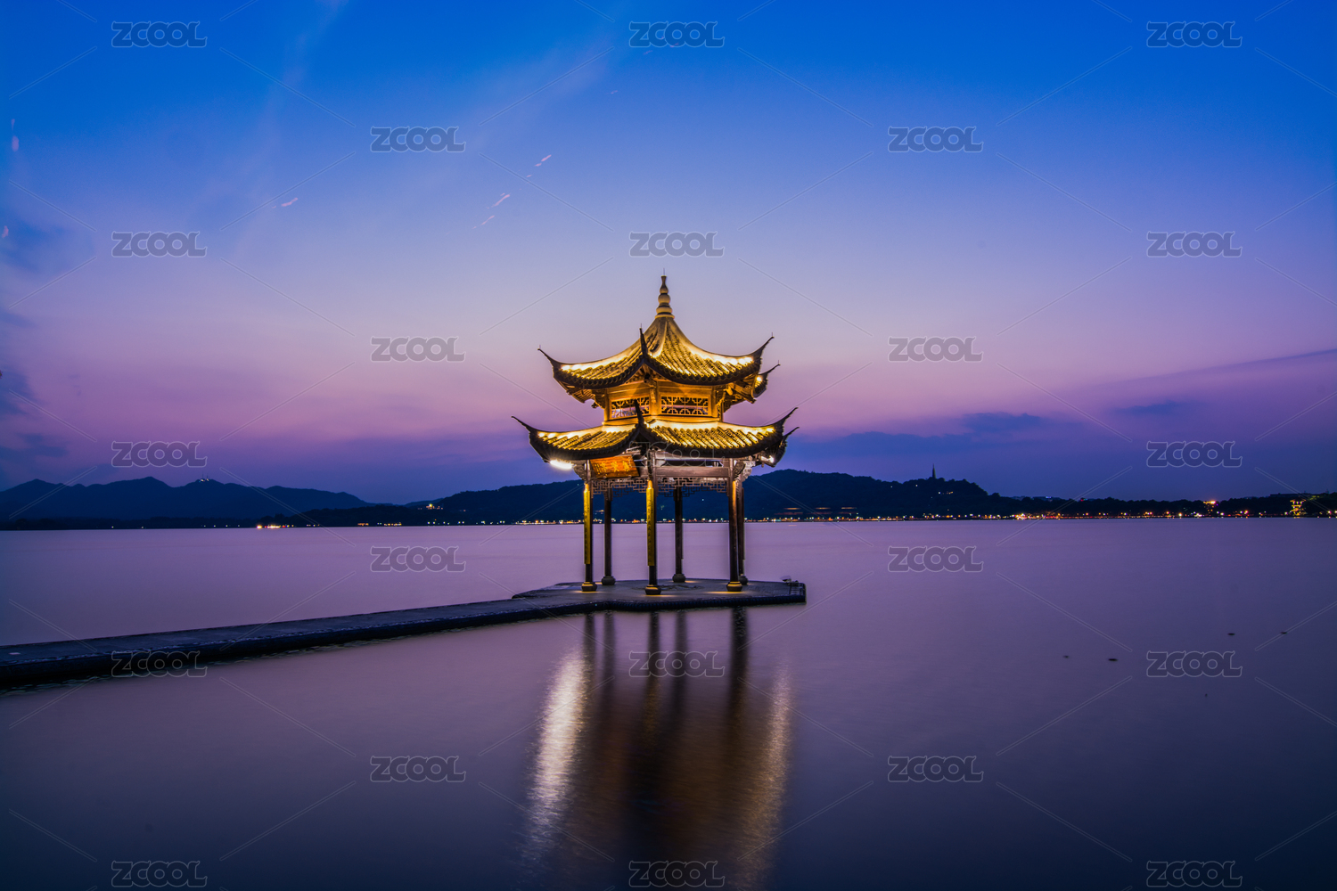 中国浙江杭州西湖夜景江南园林夜景集贤亭