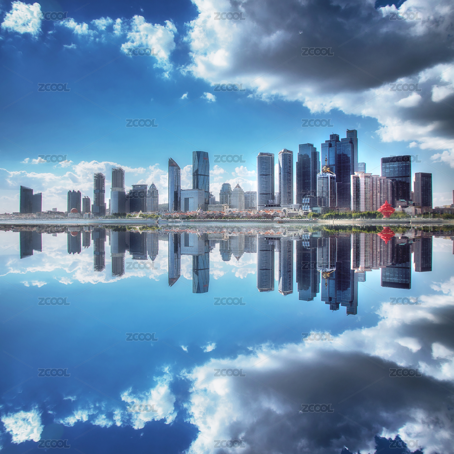 山东青岛蓝天白云下的中央商务区楼宇倒影