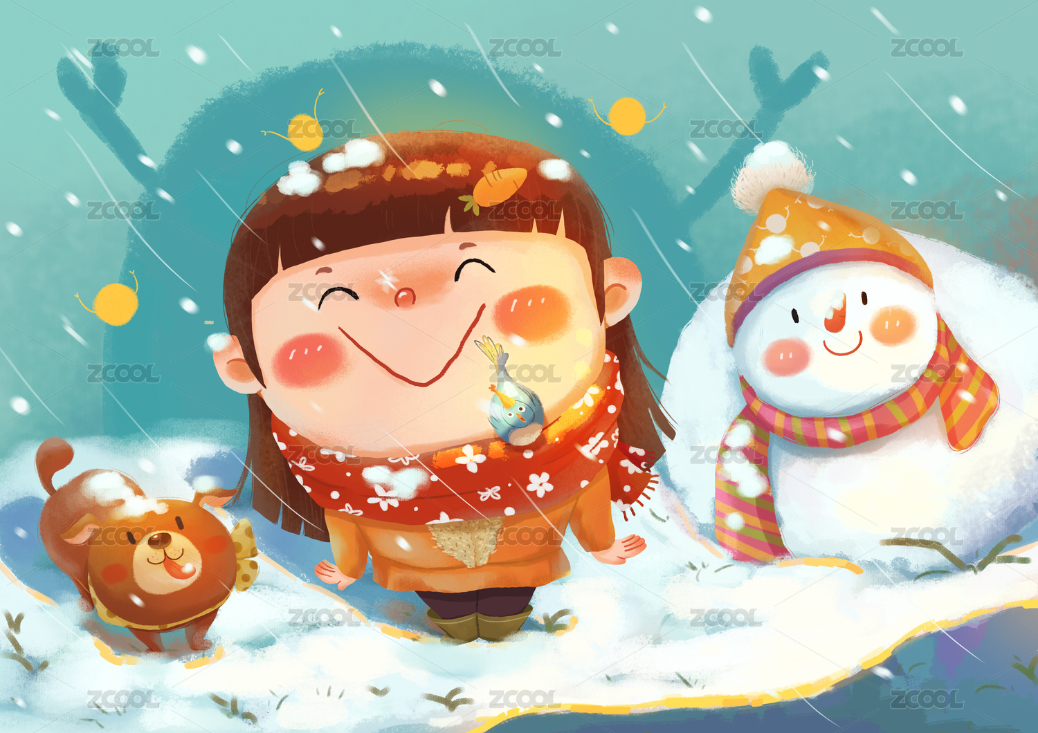女孩,狐狸,雪人,冬季,雪景,夕阳,大雁,白云,房子,枯树