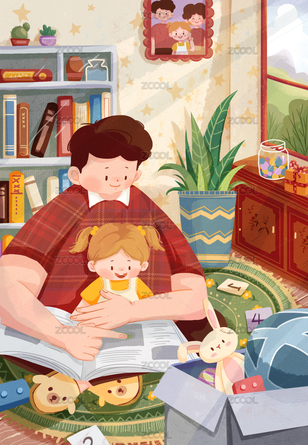 扁平室内爸爸带着孩子阅读学习温馨亲子时光