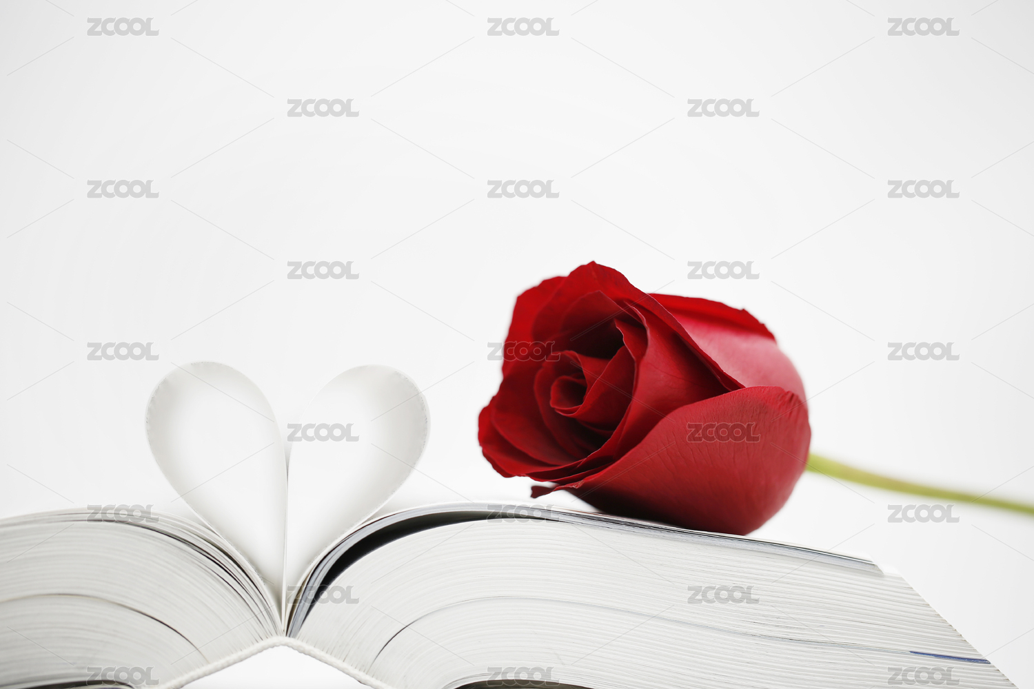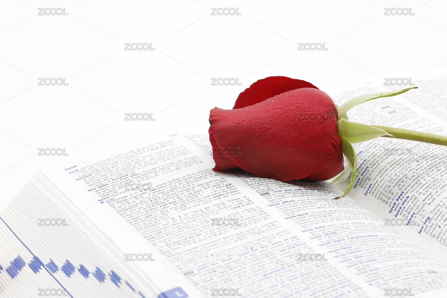 一本打开的书本上放着一朵粉红色的盛开的玫瑰花